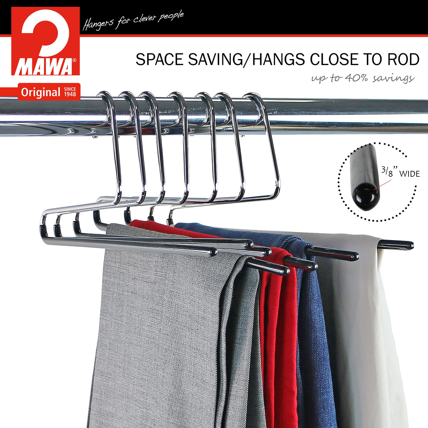 - Q: How does this hanger help maximize closet space? A: The space-efficient design of the Mawa hanger can maximize closet space by as much as 40 percent, allowing for a more organized storage solution.