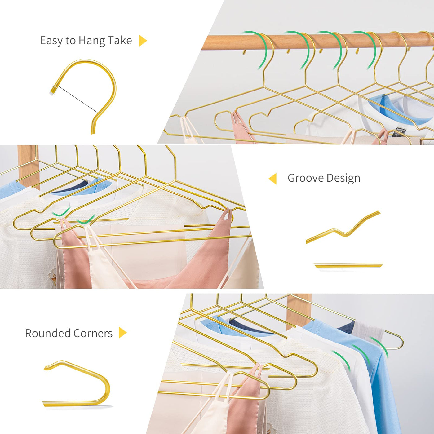 • Q: What makes these hangers different from standard plastic hangers? A: These hangers are made of durable metal, which provides greater strength and longevity compared to standard plastic hangers, and they have an elegant aesthetic appeal.