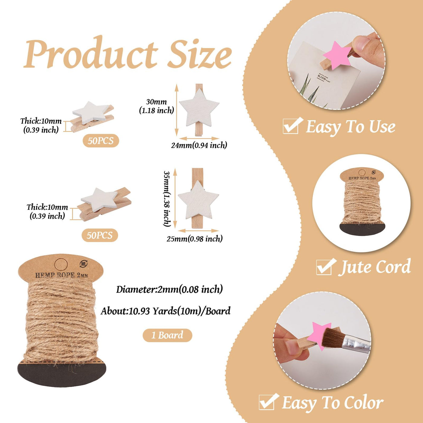 - Q: What are the dimensions of the wooden star clothespins? A: The wooden star clothespins come in two sizes: 35 millimeters by 25 millimeters and 30 millimeters by 24 millimeters.