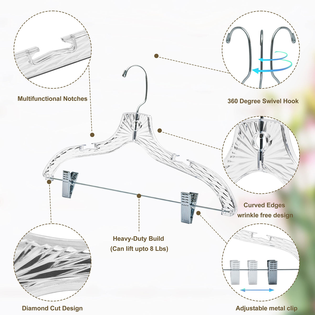 Quality Hangers 12 Pack Clear Plastic Skirt Hangers - Crystal Cut Pants Hangers - Durable Plastic Hanger Set - Dress Hangers Wit