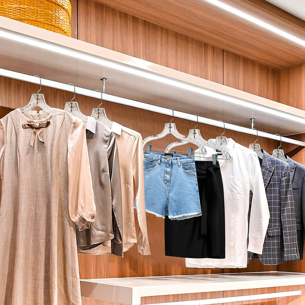 - Q: Do the hangers have any special features? A: Yes, the hangers feature adjustable clips, a 360-degree metal swivel hook, multifunctional notches, and rubber padding on the clips to securely hold clothing and prevent wrinkles.