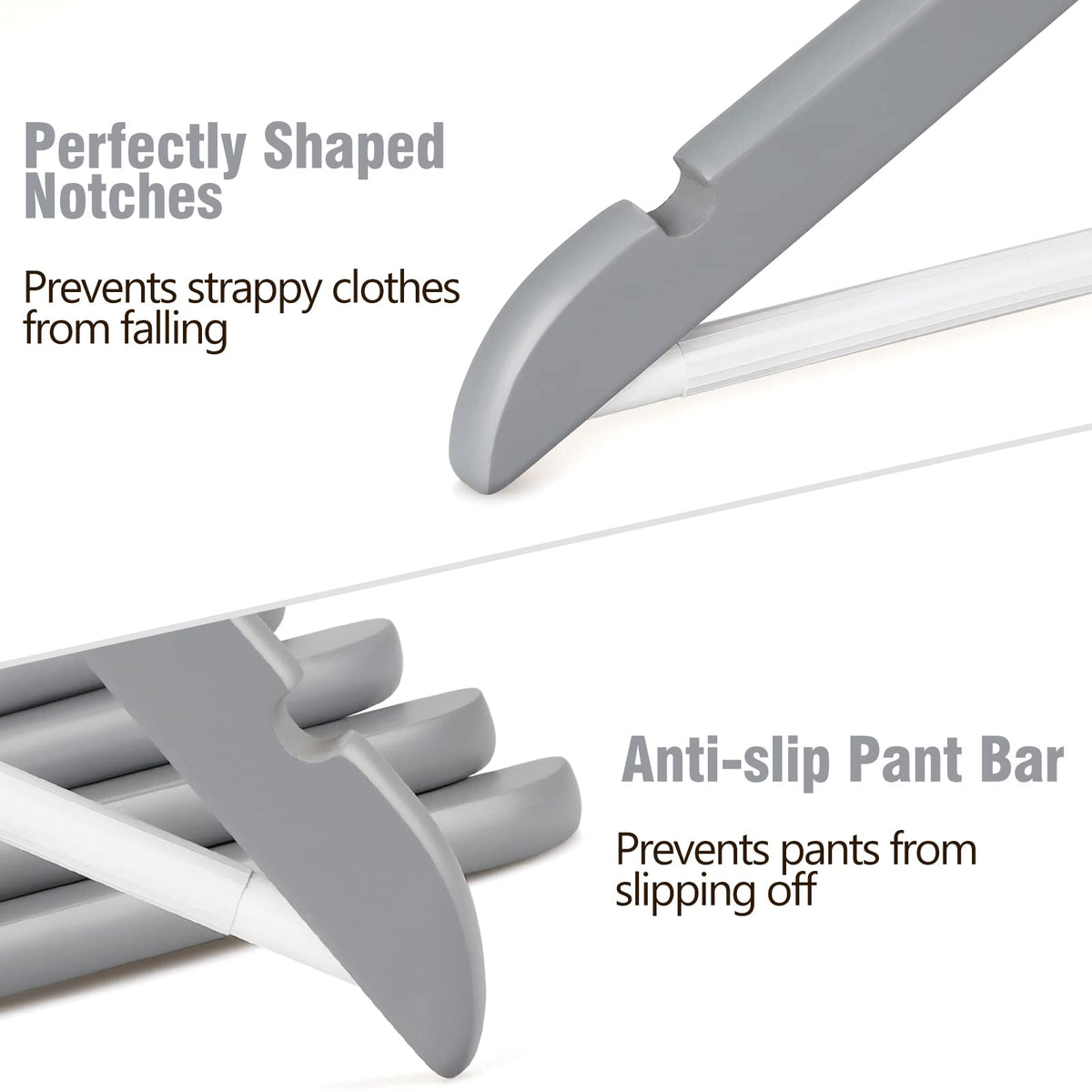- Q: Do these hangers have a non-slip feature for holding pants? A: Yes, the bottom pant bar is wrapped with a clear grooved strip to grip pants, slacks, trousers, or jeans, preventing them from sliding off.