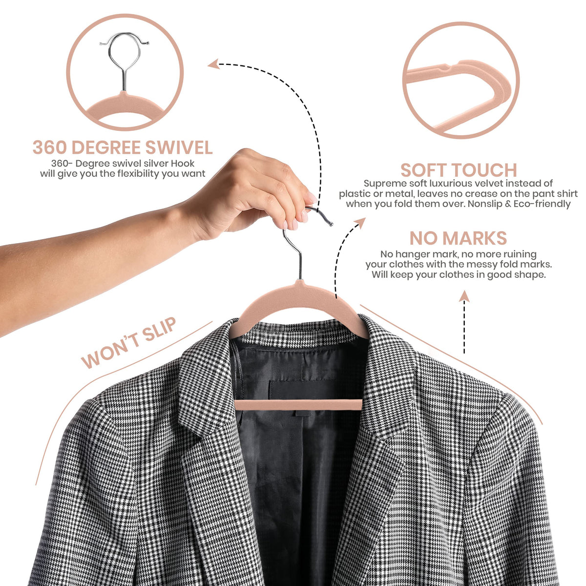 • Q: Are the hangers non-slip? A: Yes, the hangers feature a velvet-coated surface that prevents clothes from slipping off.