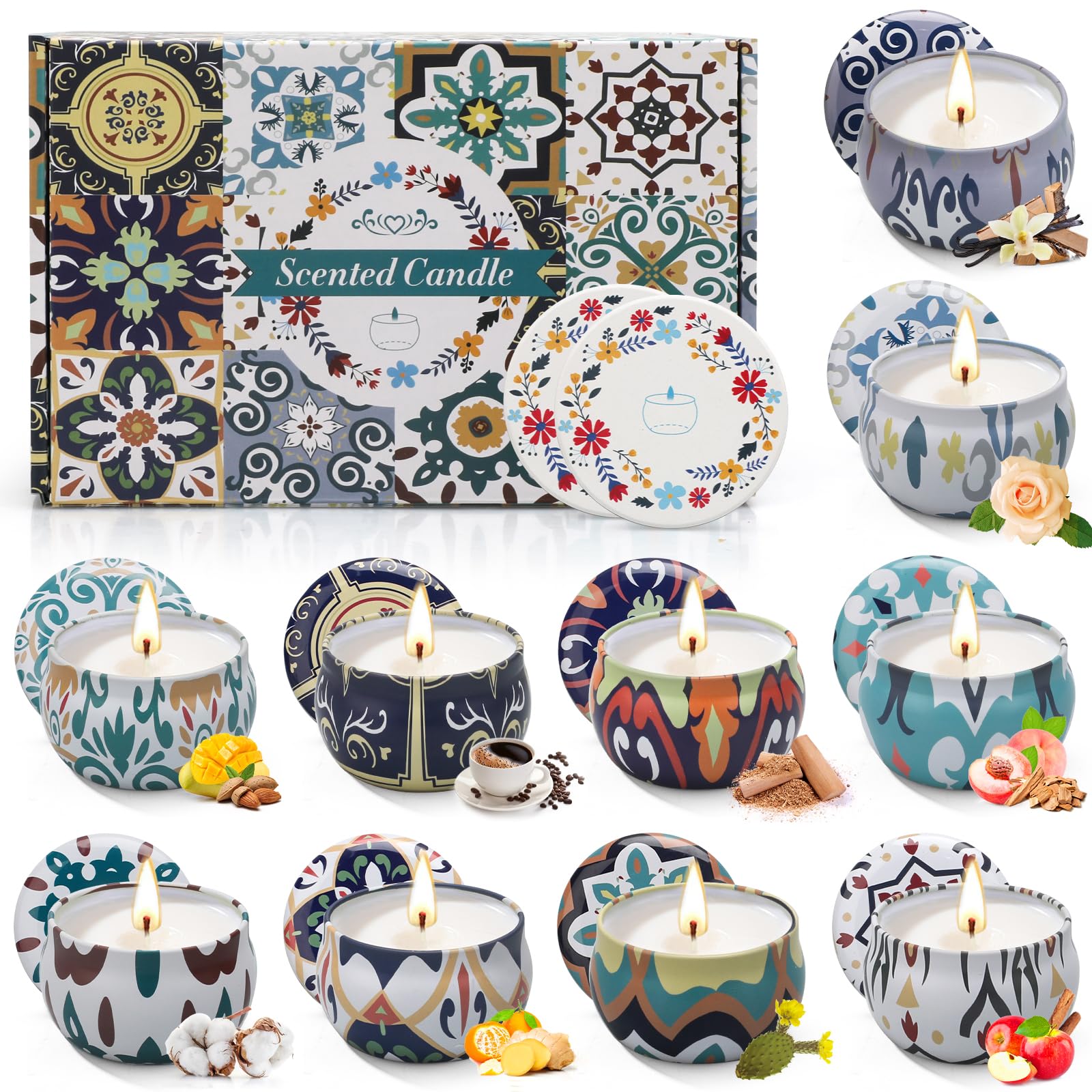 - Q: What scents are included in the Scented Candles Gift Set? A: The Scented Candles Gift Set includes 10 different scents: Fiji White Sands, Coffee, Cinnamon Apple, Champagne Rose, Mango Almond, Marshmallow Fireside, Mahogany Teakwood, Cotton, Orange & Mint, and Cactus Flower.