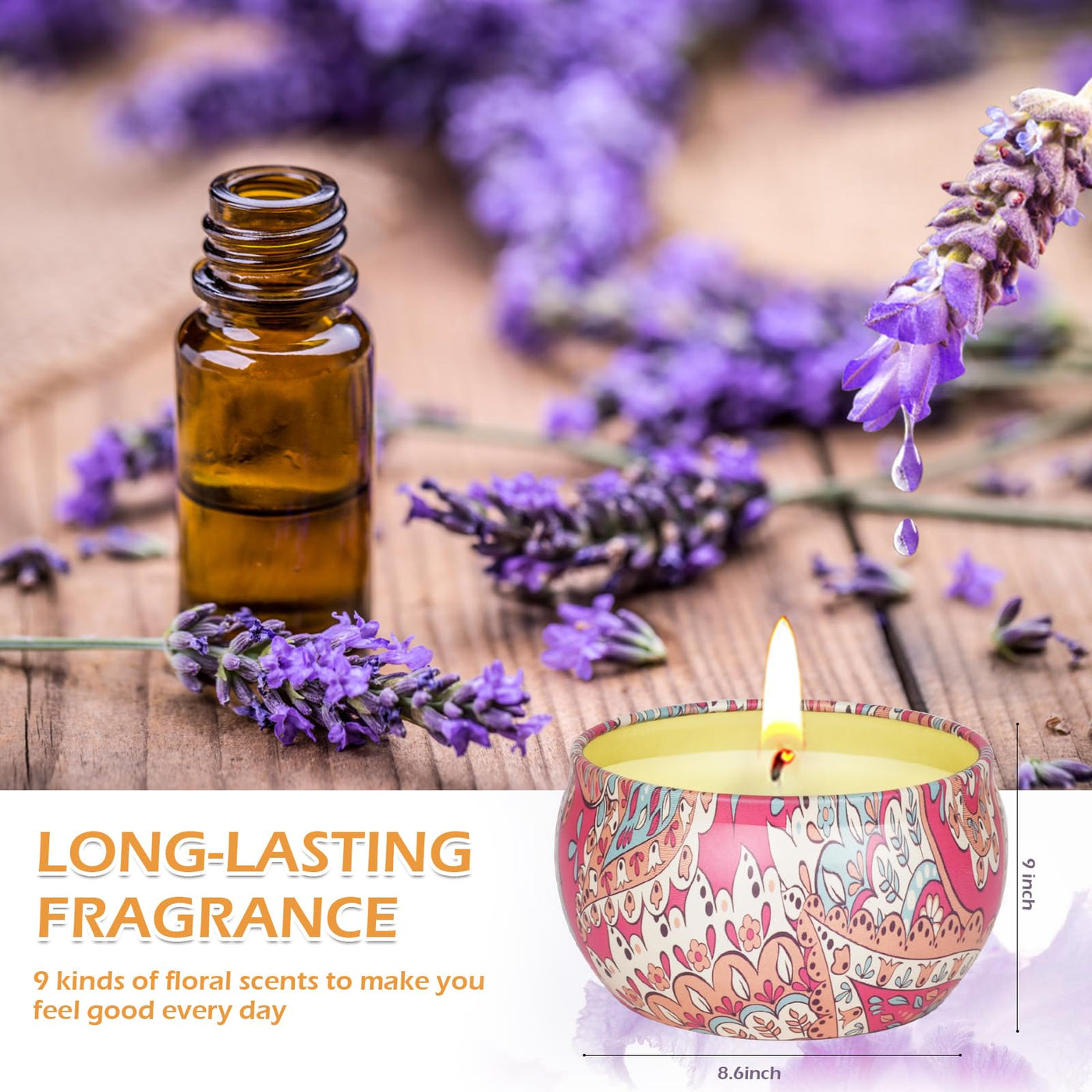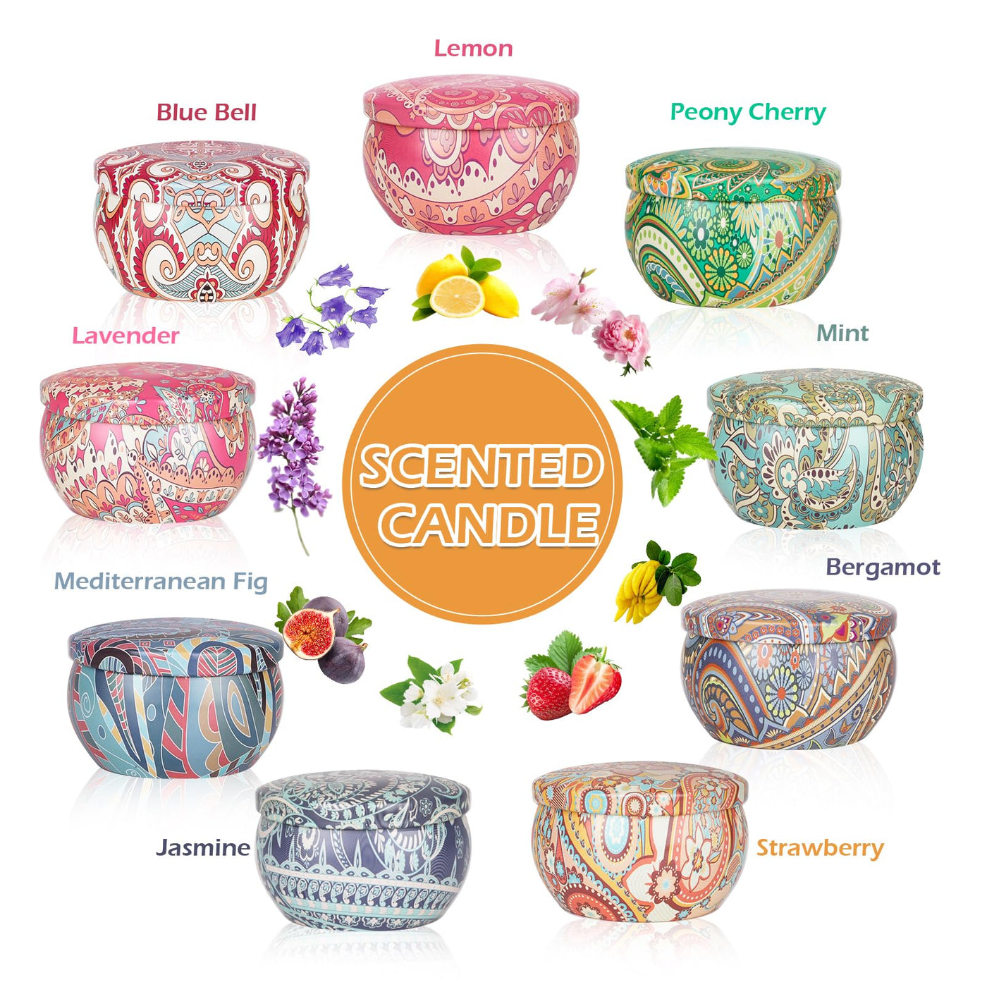 - Q: What scents are included in the 9 pack of scented candles? A: The 9 pack of scented candles includes a variety of scents: Lavender, Blue Bell, Mint, Jasmine, Peony Cherry Lemon, Strawberry Bergamot, and Mediterranean Fig.