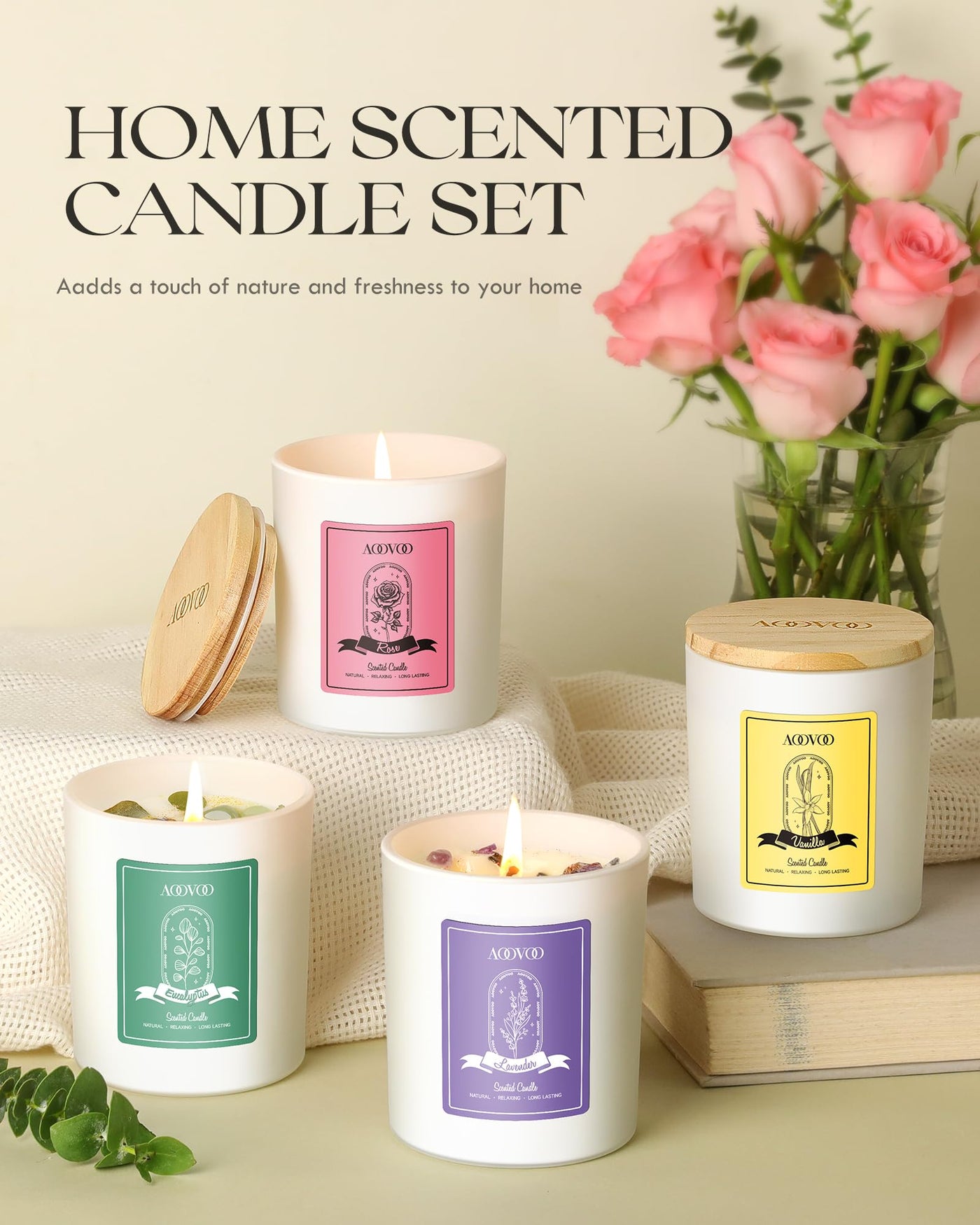 - Q: What scents are included in the AOOVOO scented candle set? A: The AOOVOO scented candle set includes four delightful scents: Rose, Vanilla, Eucalyptus, and Lavender.