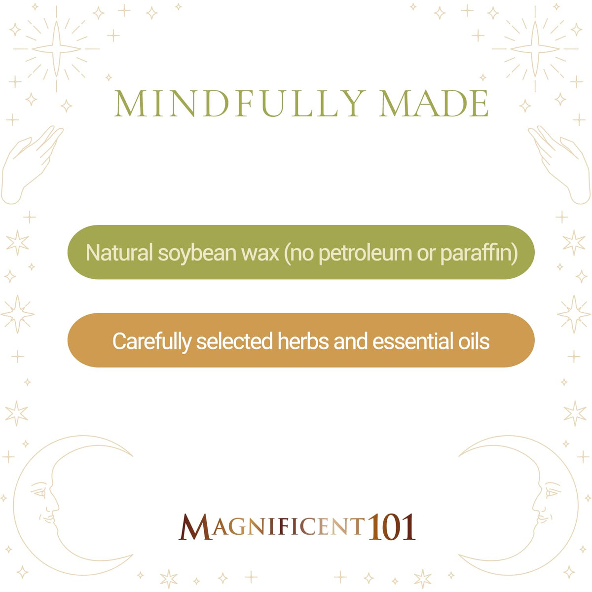 - Q: What are the main ingredients in the Magnificent 101 Abundance Aromatherapy Candle? A: The Magnificent 101 Abundance Aromatherapy Candle is made from 100% natural soy wax and features essential oils of lemon, rosemary, and sandalwood.