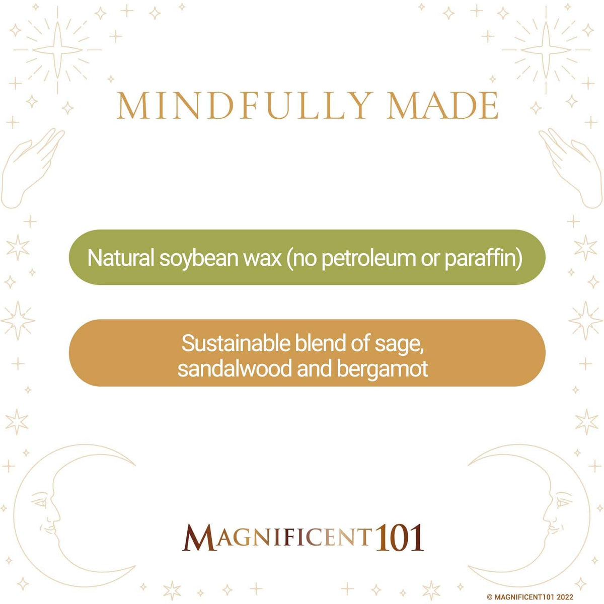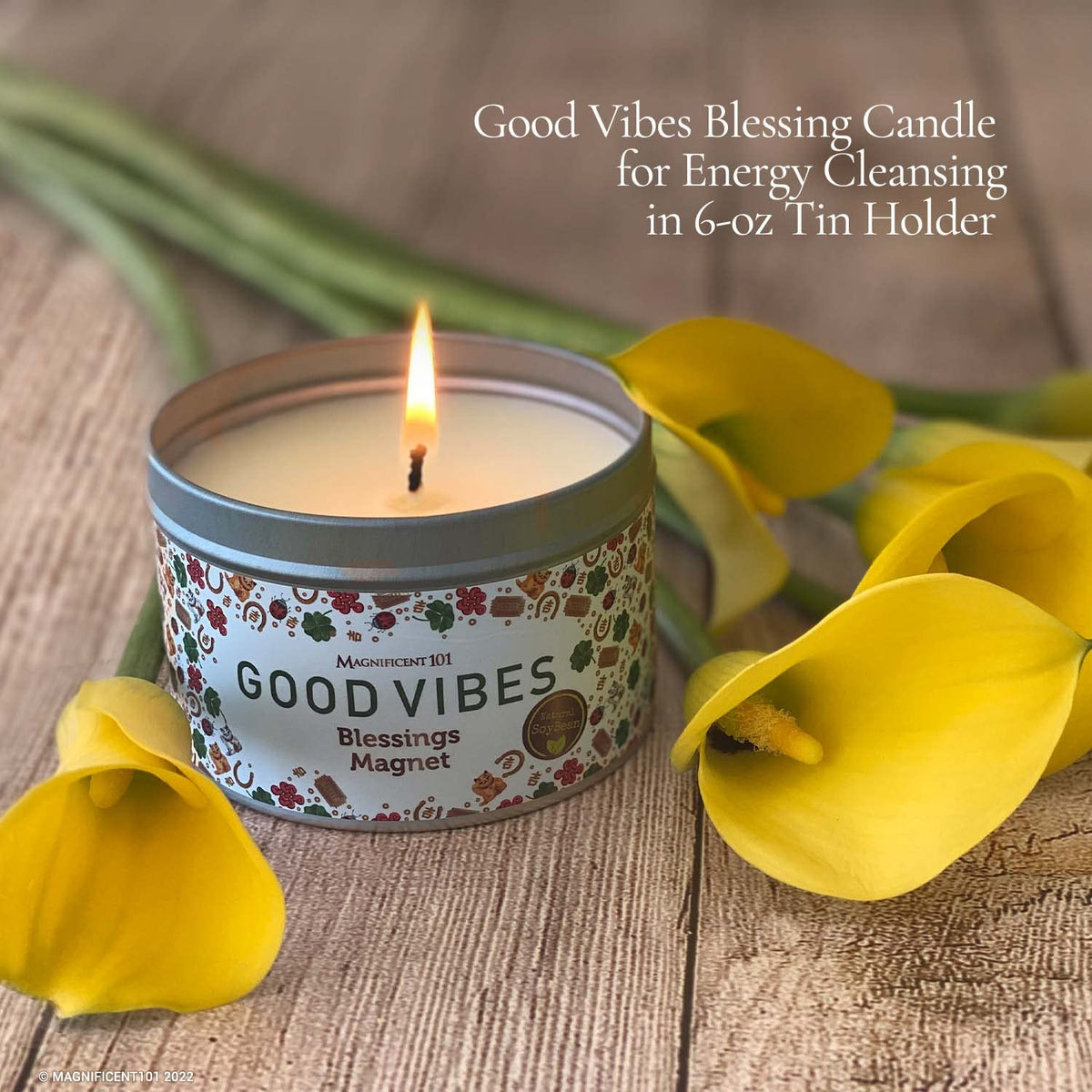 MAGNIFICENT 101 Good Vibes Aromatherapy Candle as Blessings Magnet - Sage, Bergamot, Sandalwood Scented Natural Soybean Wax Tin