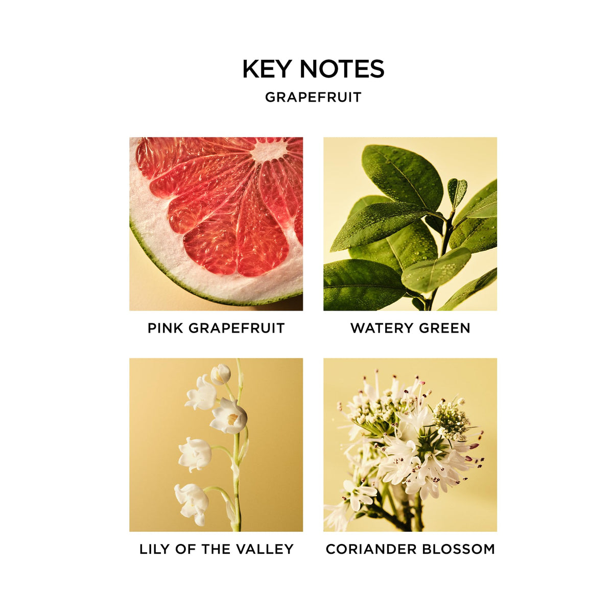 • Q: What fragrance notes are included in the grapefruit scent? A: The grapefruit scent features pink pomelo grapefruit, watery green notes, lily of the valley, and coriander blossom.