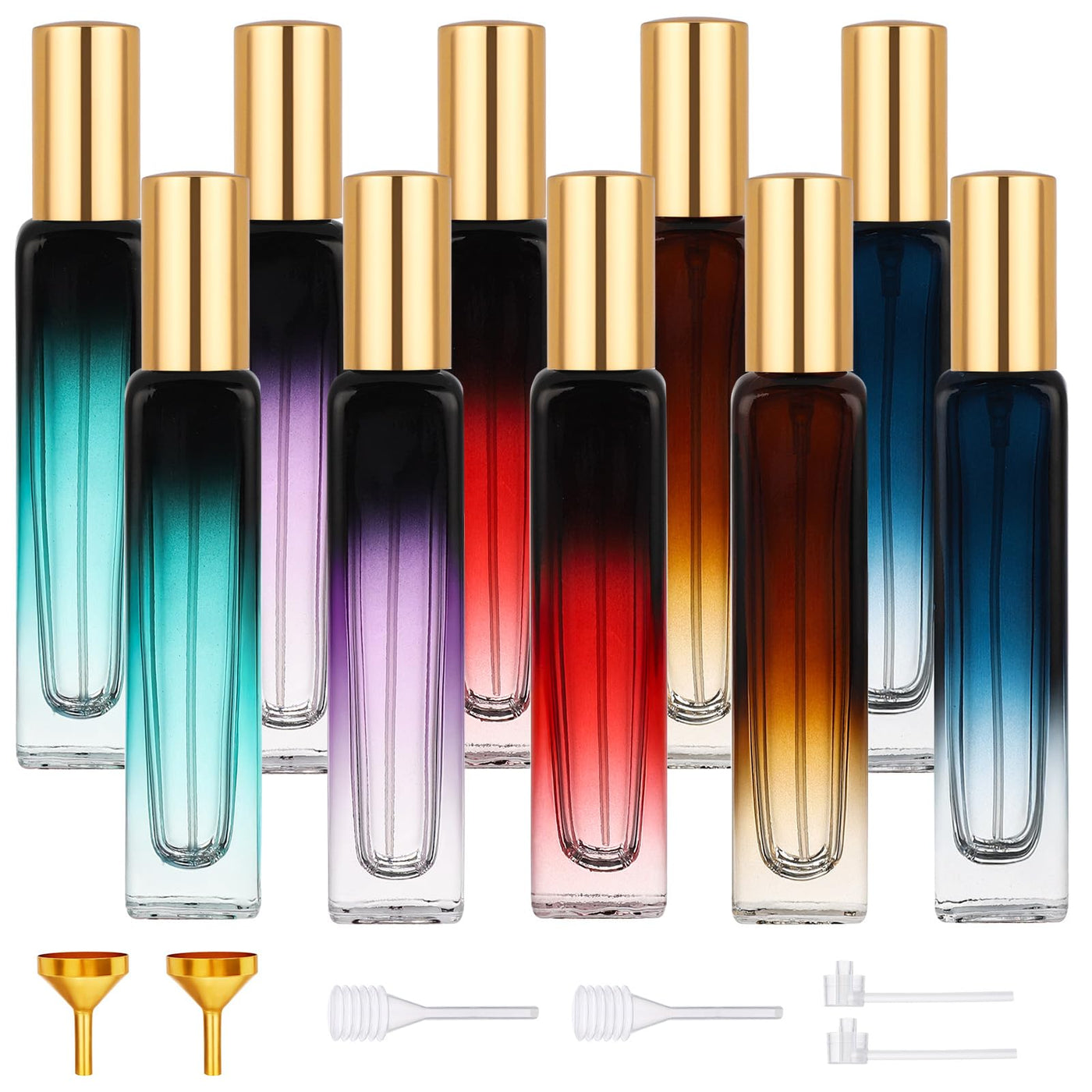 About The Product: Color: Purple Black Blue Red Green Volume: 0.5Oz/15Ml Package Includes: 10Xperfume Bottles,Dropper,Aluminum Funnels,Dispensing Pump