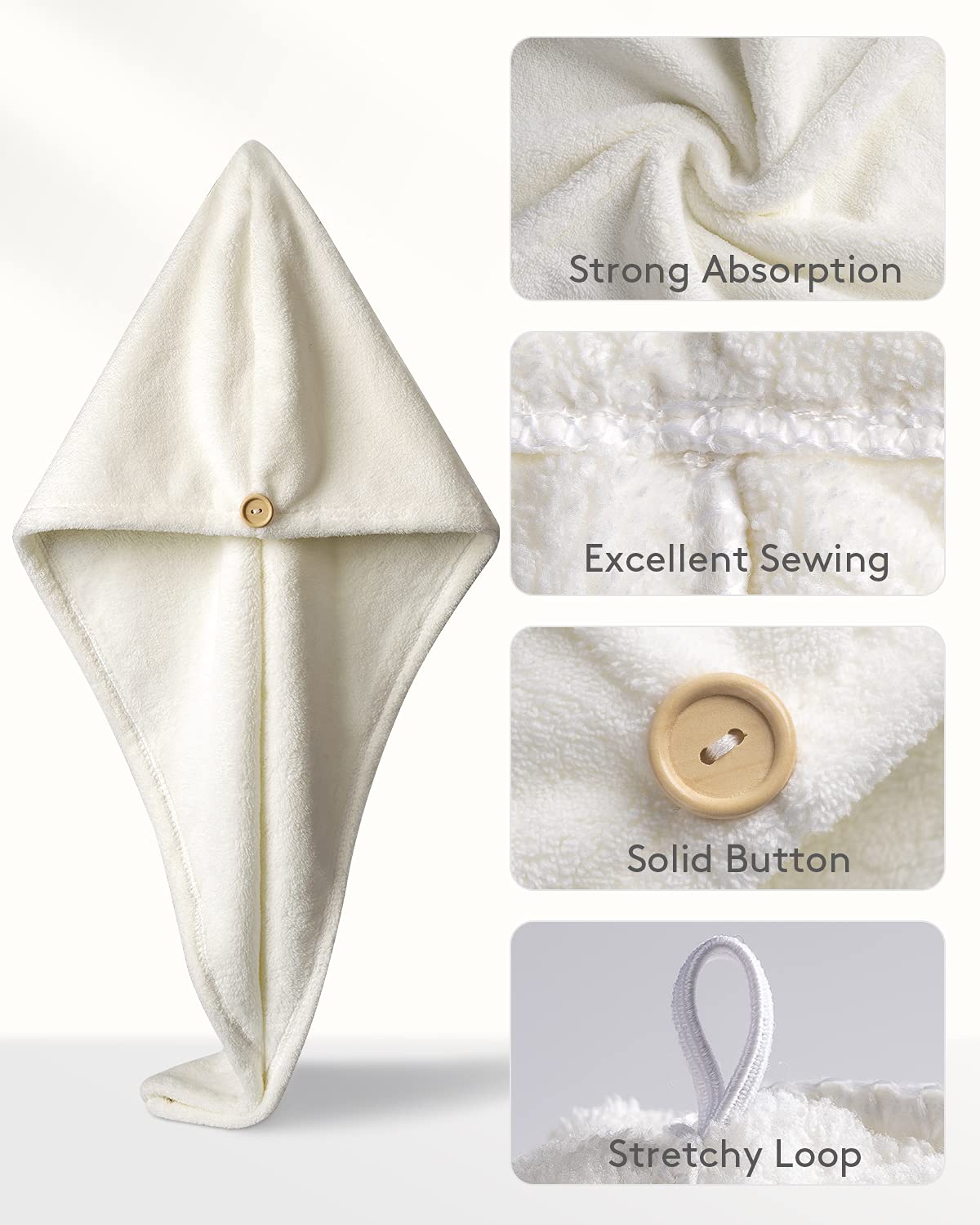 - Q: Is the hair towel easy to use during activities like makeup or swimming? A: Yes, the hair towel features a solid button and stretched loop to prevent slipping, making it ideal for use during makeup, bath, facial treatments, or even swimming.