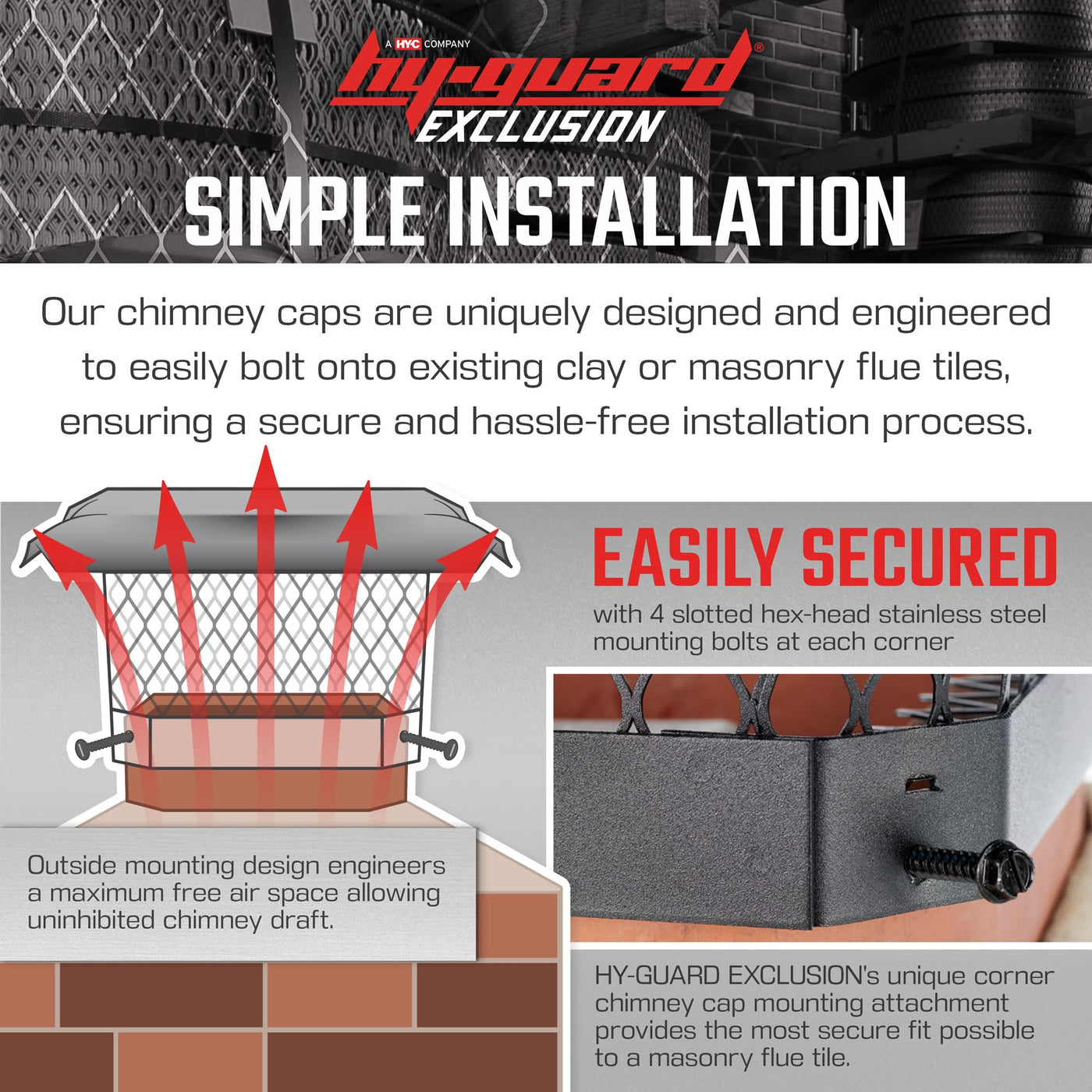 - Q: Is the installation of this chimney cover easy? A: Yes, the HY-GUARD Chimney Cover features a simple bolt-on installation that allows it to securely attach to existing clay or masonry flue tiles.