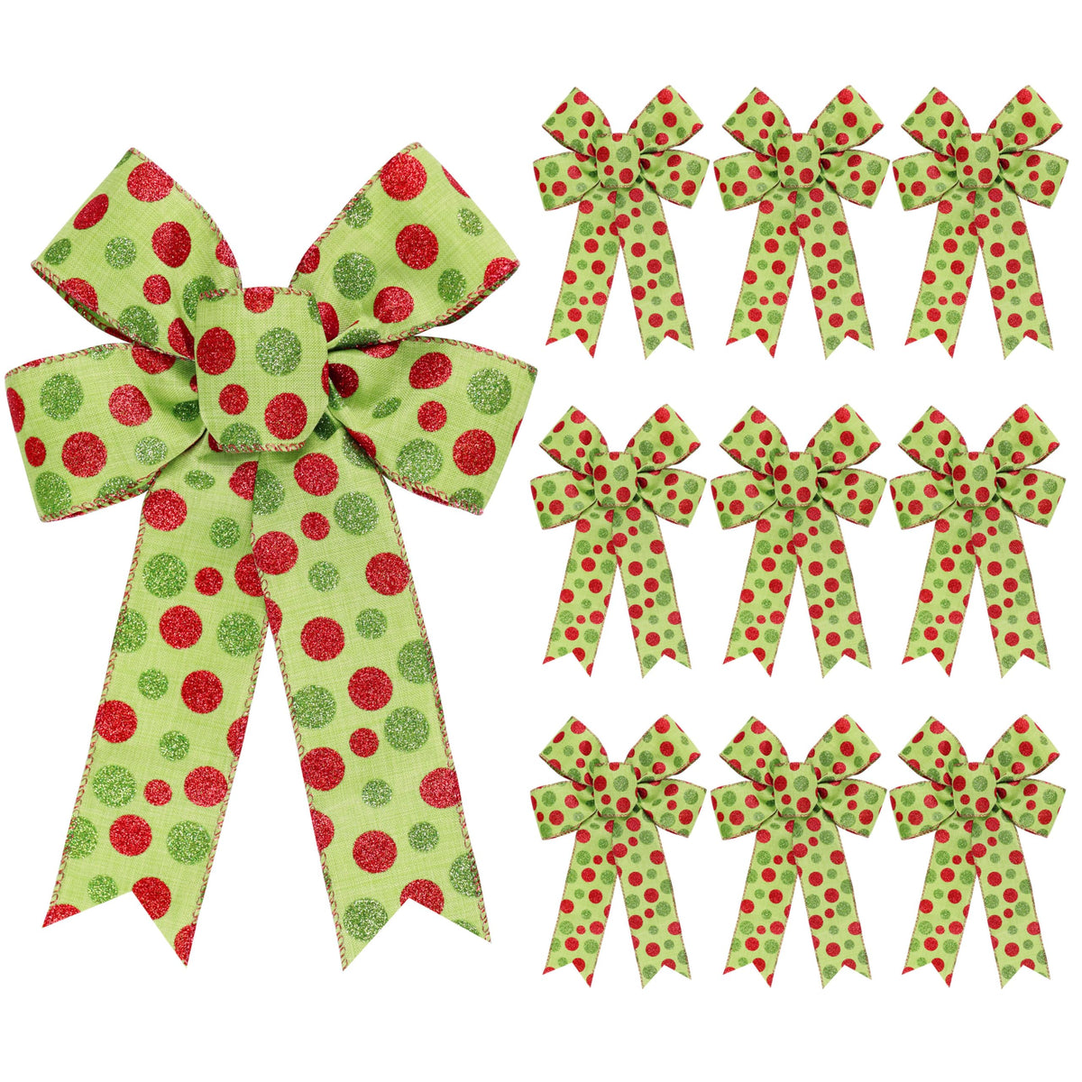 10 Pack Red Green Bows Christmas Tree Decorations,9 x13 Large Wreath Bow with Glitter Red Green Dot for Xmas Home Fence Sta