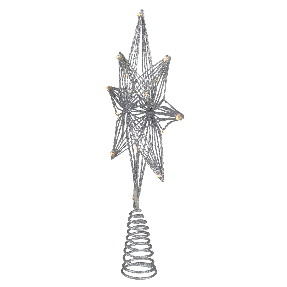 Light up any room easily with this beautiful geometric-shaped star tree topper. The elegant design will add the finishing touches to your holiday decor. Also perfect as a gift Product Features:. Lighted wire tree topper Christmas star decoration. Star has a shiny silver glitter finish. Pre-lit with 30 warm white fairy lights. Features a geometric diamond design. Unique circular cone wire base. Requires 2 AA batteries (not included). Convenient on/off switch on the battery pack. Recommended for indoor use only; if using outdoors keep in covered area Dimensions: 13.75H x 10W x 1.25 D. Base measure 2 wide at the widest point Material(s): plastic/metal