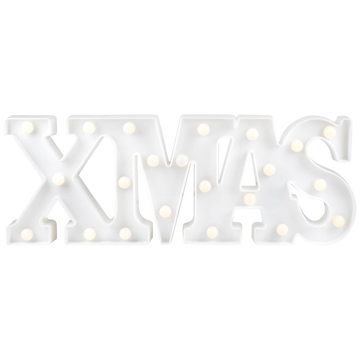 It's starting to look a lot like Christmas. Deck the walls with our modern lighted XMAS marquee sign. A wonderful addition to your Christmas decor this season. The sign is lined with warm lights that give off a soft glow. Product Features:. Color: warm white bulbs. One-sided design. Illuminated by 22 LED lights. LED lights use up to 80% less energy. Bulbs stay cool to the touch. Requires (2) AA size batteries - not included. Convenient on/off switch on the back. Comes ready-to-hang with two keyhole hooks on the back Dimensions: 6.75H x 18.5W x 1.75D. Material(s): plastic Note: batteries not included