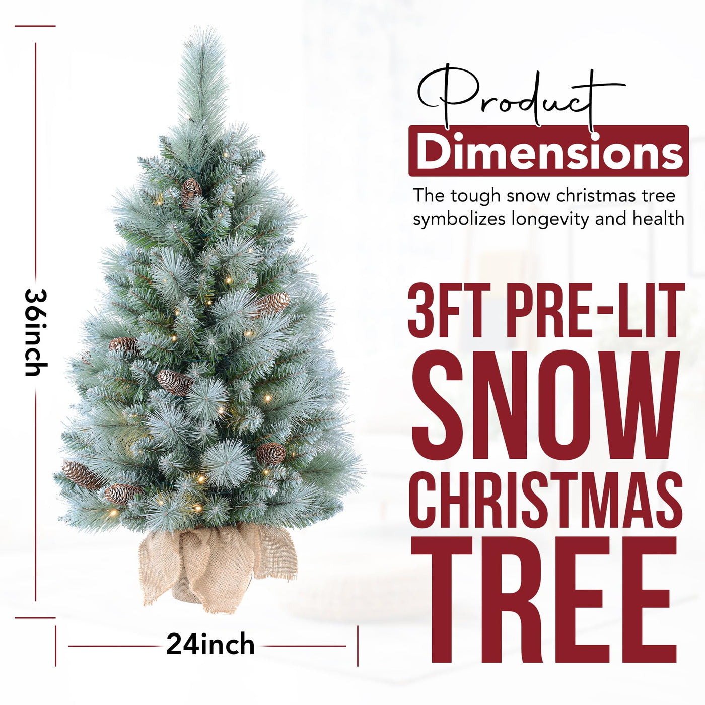 3ft Pre-Lit Mini Snow Christmas Trees Battery Operated with 80 LED Lights, Burlap Artificial Tabletop Christmas Trees,Home Party for Kitchen Home Decor