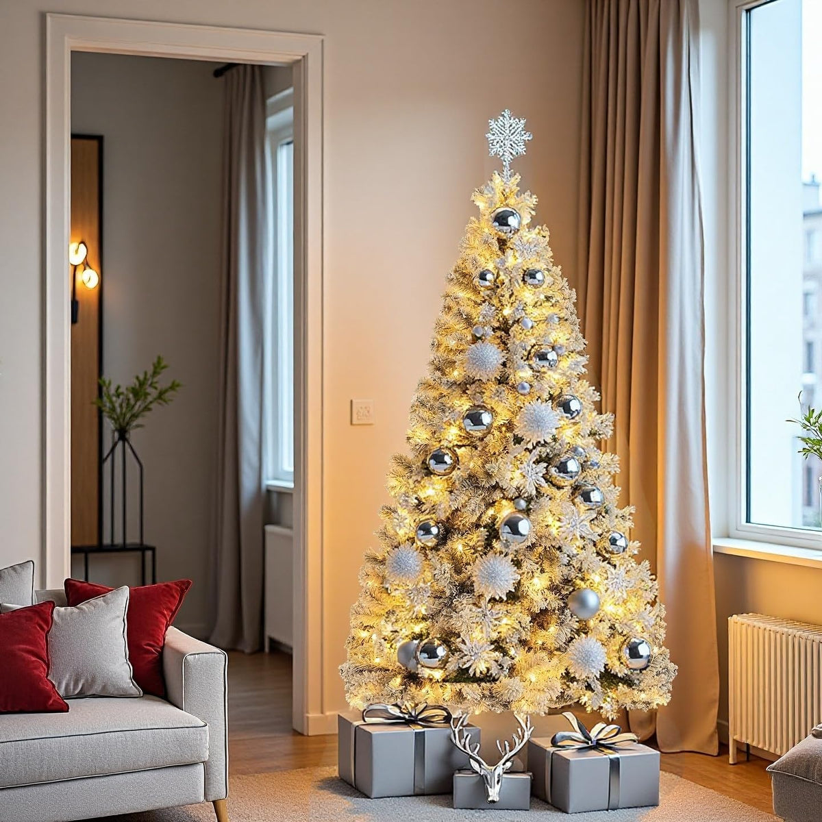 Bring home the magic of a snow-covered forest with this 6FT Flocked Green Artificial Christmas Tree, pre-lit with 250 warm white LED lights for a classic yet elegant holiday centerpiece. Blending the natural charm of green branches with soft white flocking, this tree captures the essence of a cozy winter wonderland. The lush, full-bodied silhouette is created with lifelike PVC tips, offering plenty of space for ornaments, tinsel, and tree toppers. The built-in LED lights eliminate the hassle of tangled cords and provide a warm glow that reflects beautifully off the snow-tipped branches. Designed for indoor use in homes, apartments, living rooms, offices, or seasonal displays, this tree brings festive beauty to any space. With its three-hinged section structure and sturdy metal stand, assembly and storage are quick and simple. Whether you're decorating for a family gathering, a holiday photoshoot, or simply setting the mood for Christmas morning, this pre-lit flocked tree transforms your space into a winter retreat-no snow required.