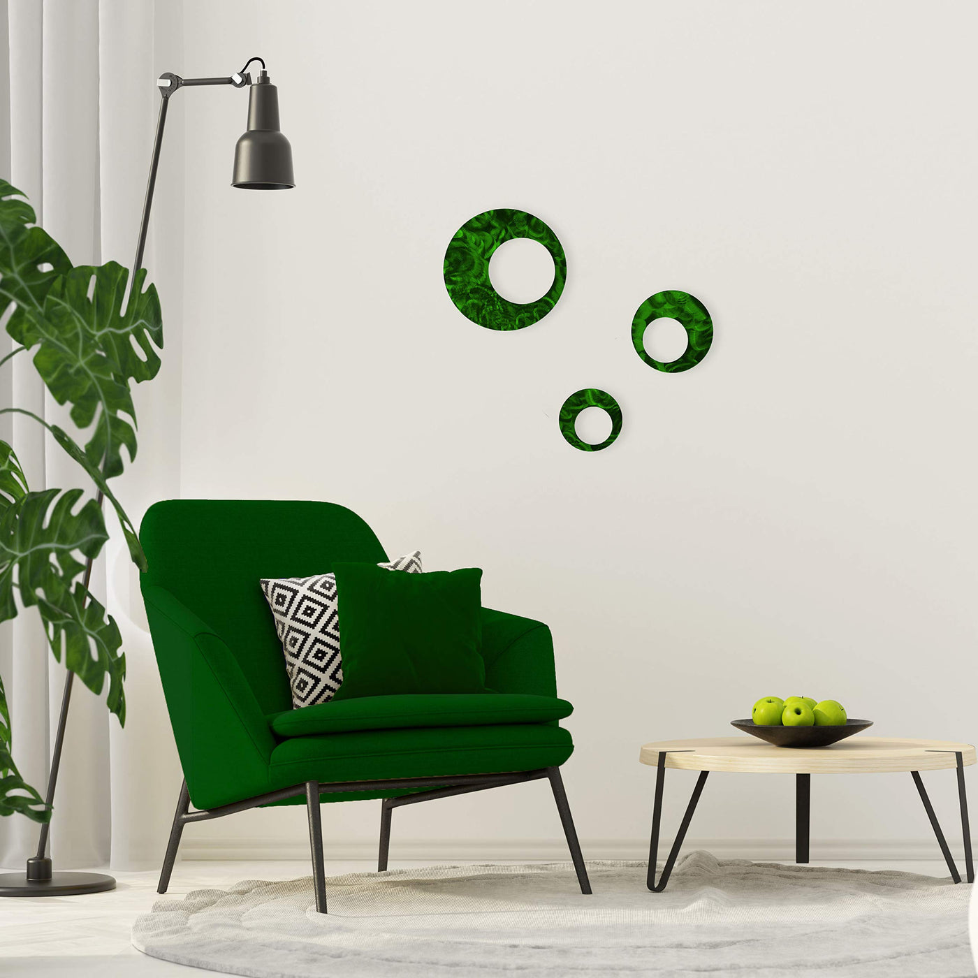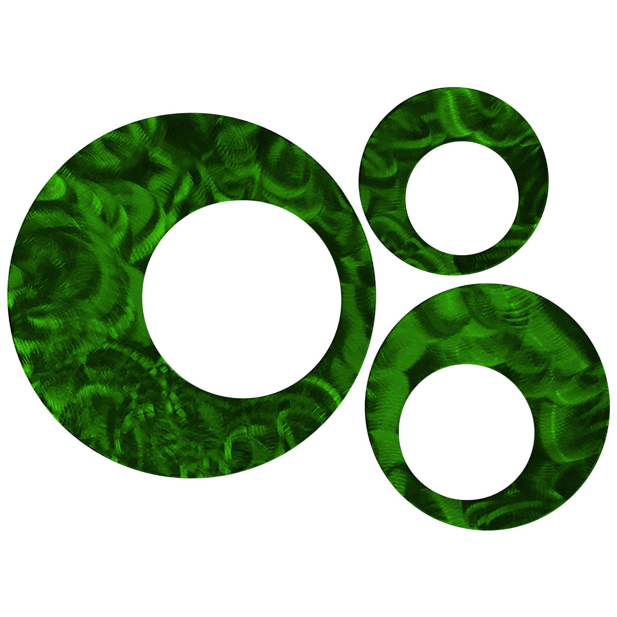 These simple circle accents are the perfect finishing touch to any decorating project. Our unique metallic finishes have just enough shimmer to really make this set of 3 circle sculptures pop from your wall. Circles measure: 1 - 6; 1 - 8; 1- 12