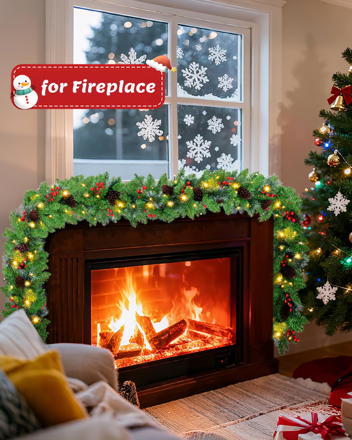 9ft Christmas Garland with Snow, Pinecones, Red Berry,50 Battery Operated Soft White LED Lights with Timer,Artificial Holiday De