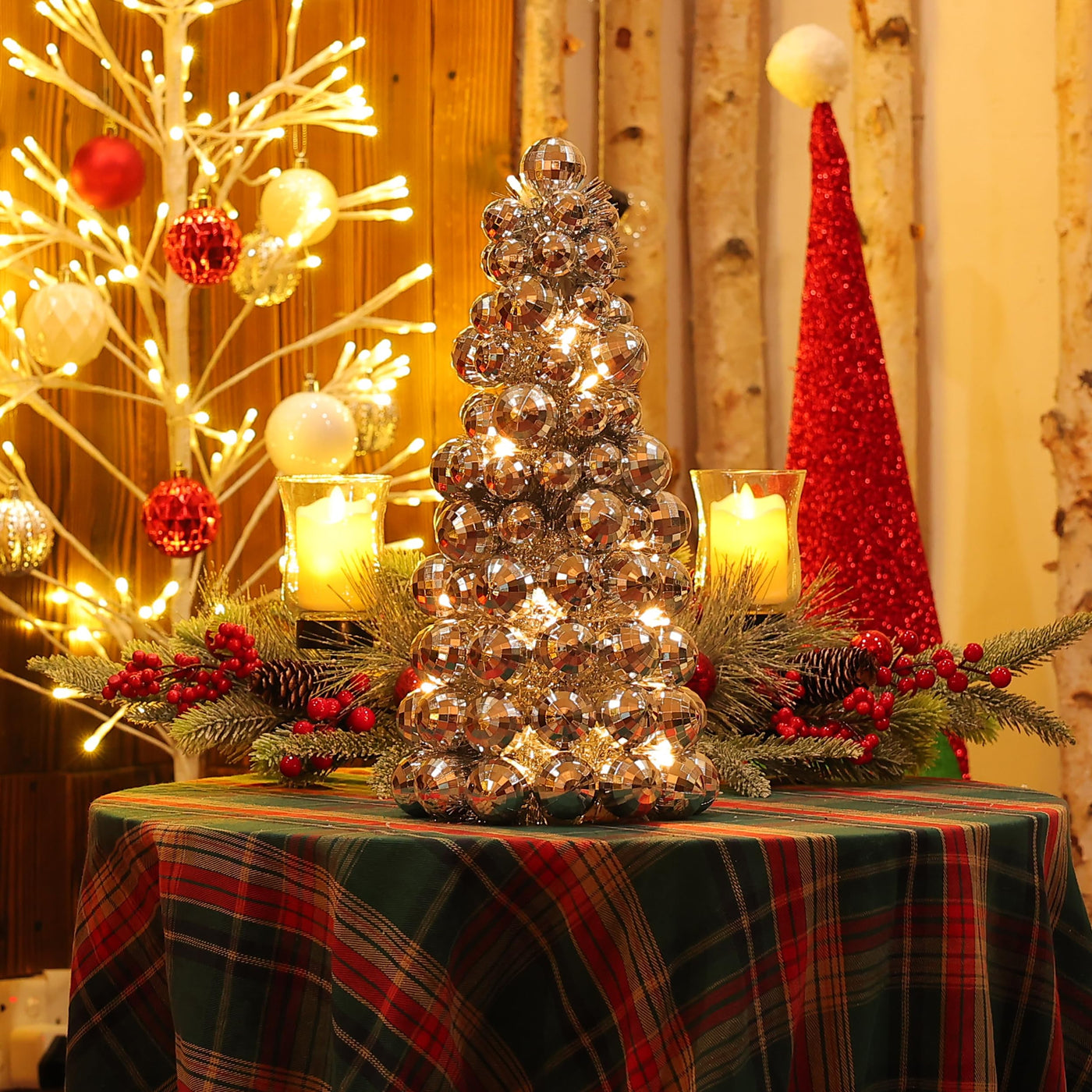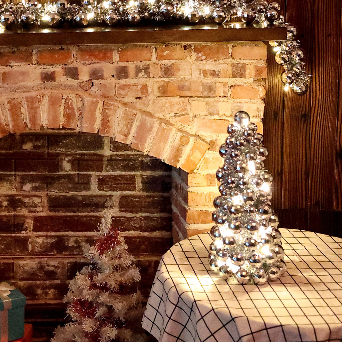 Amooca 16in Christmas Ball Tree with LED Lights Table Centerpiece Fireplace Decor Indoor Holiday Party Home Decoration Silver
