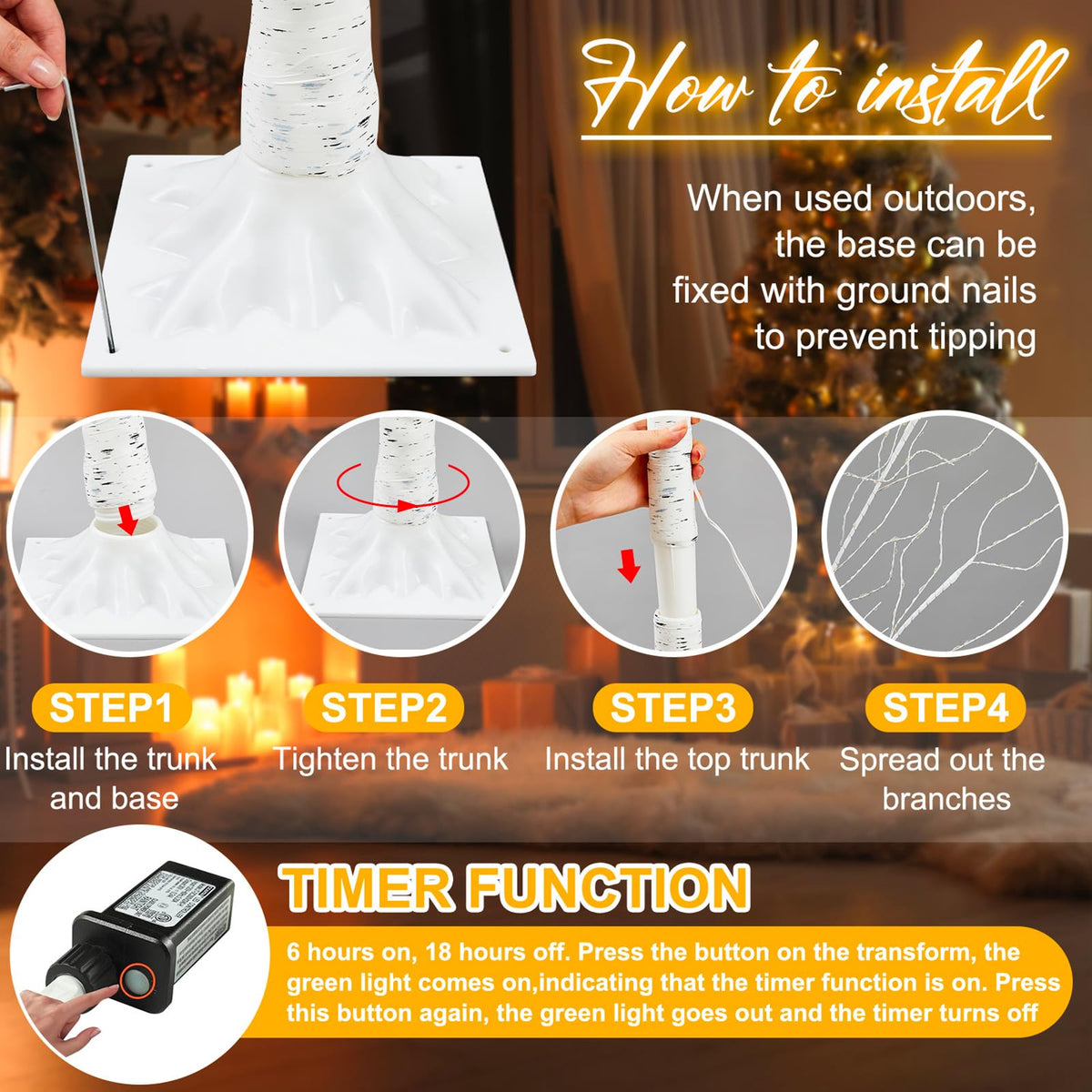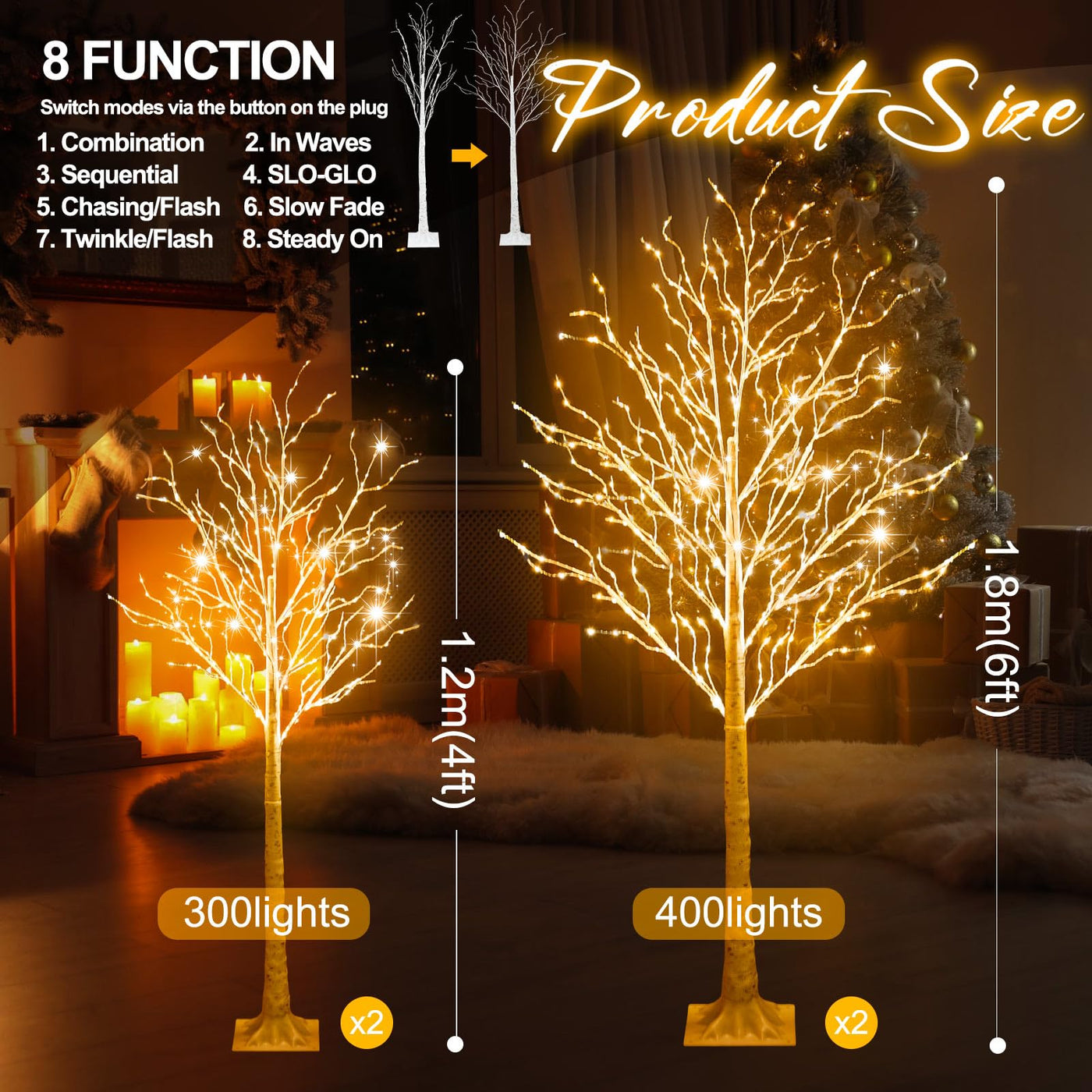 Aurelema 4 Pcs 4ft-300led, 6ft-400led Lighted Birch Tree 8 Modes Christmas Artificial LED Warm White Lights Birch Tree for Indoo