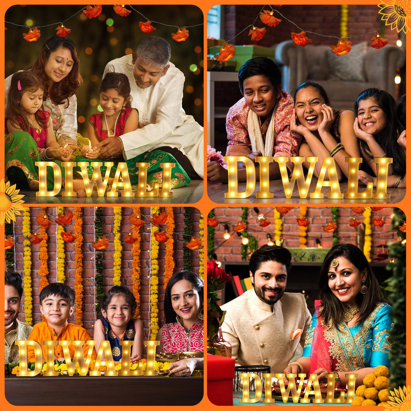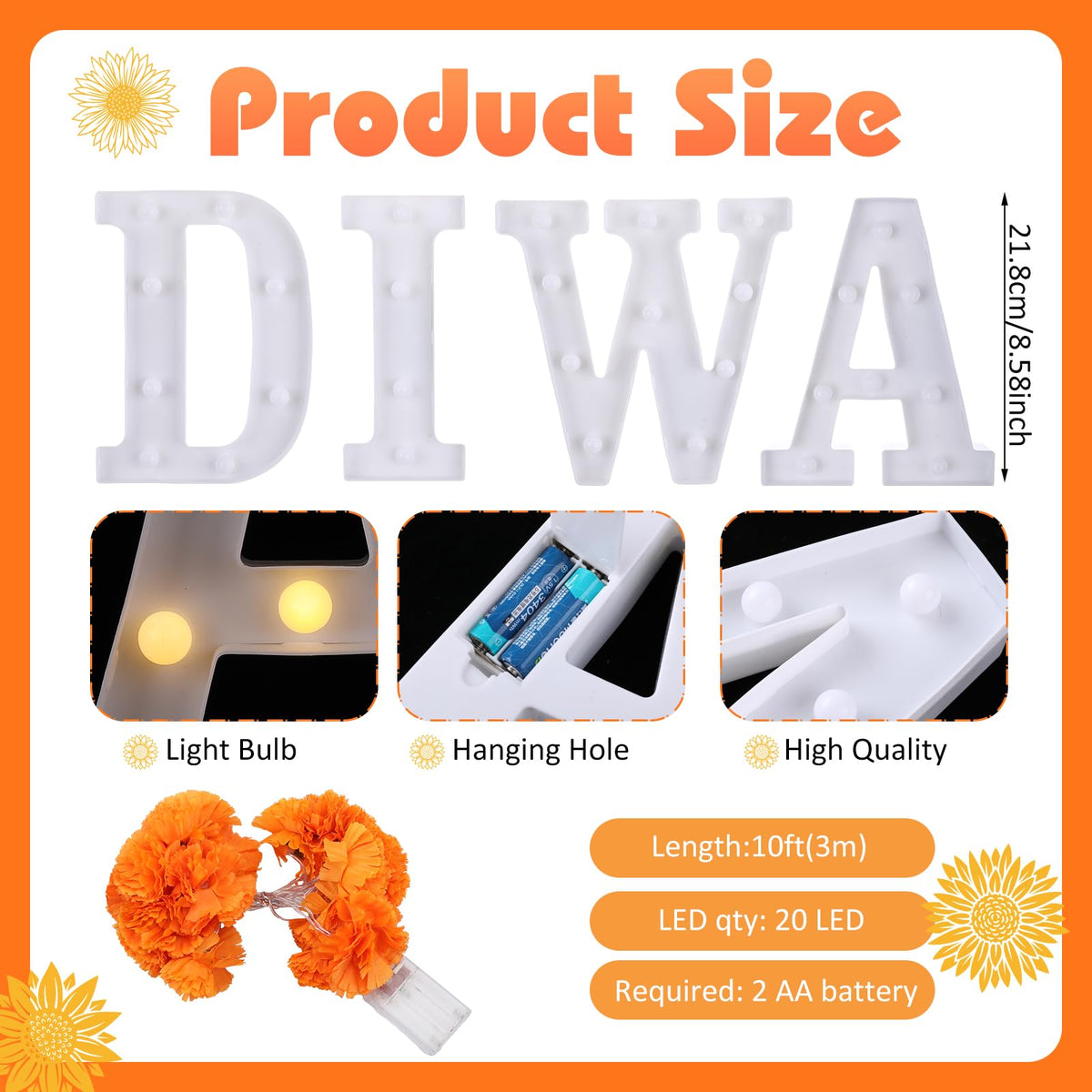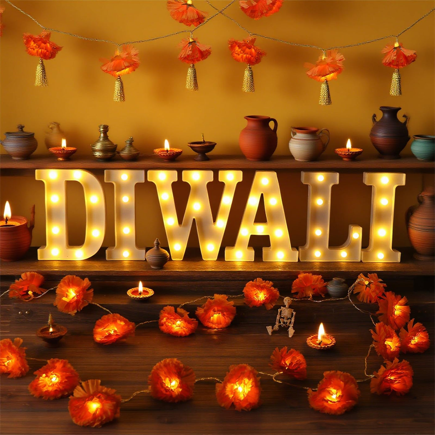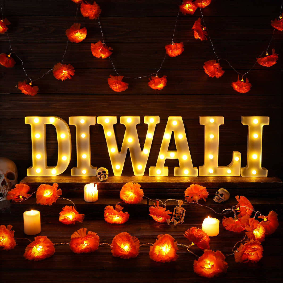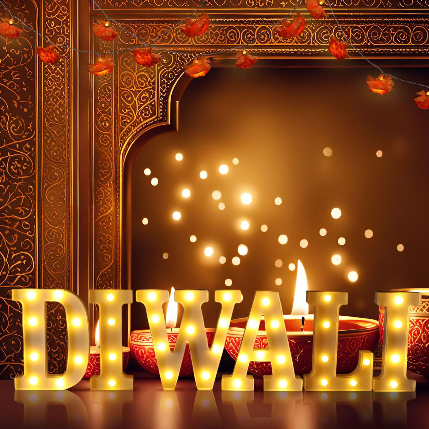Aurelema 8 Pcs Diwali Light up Letters 8.58 Inch Battery Powered Sign Letter with 2 Lighted Marigold Garland LED Artificial Mari