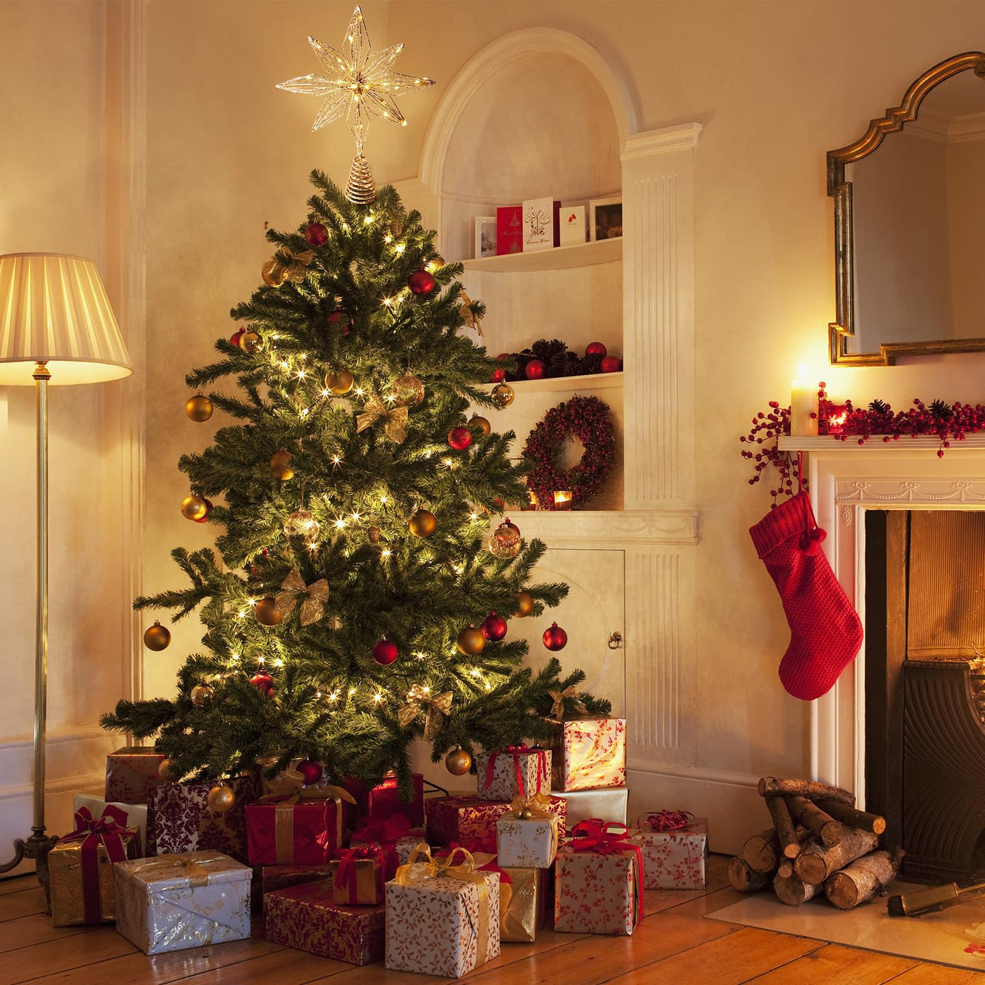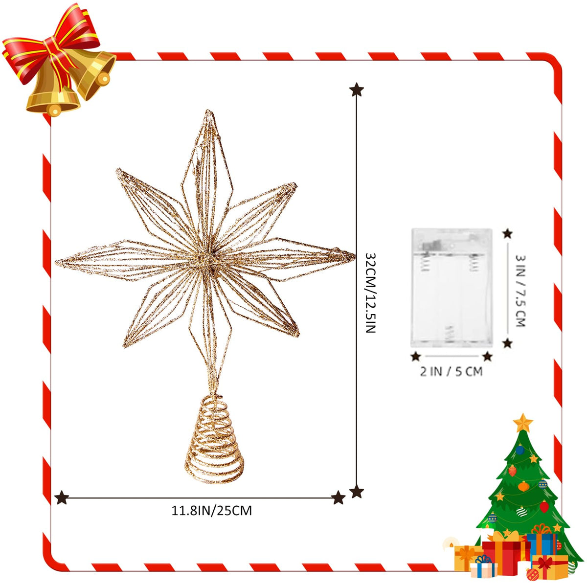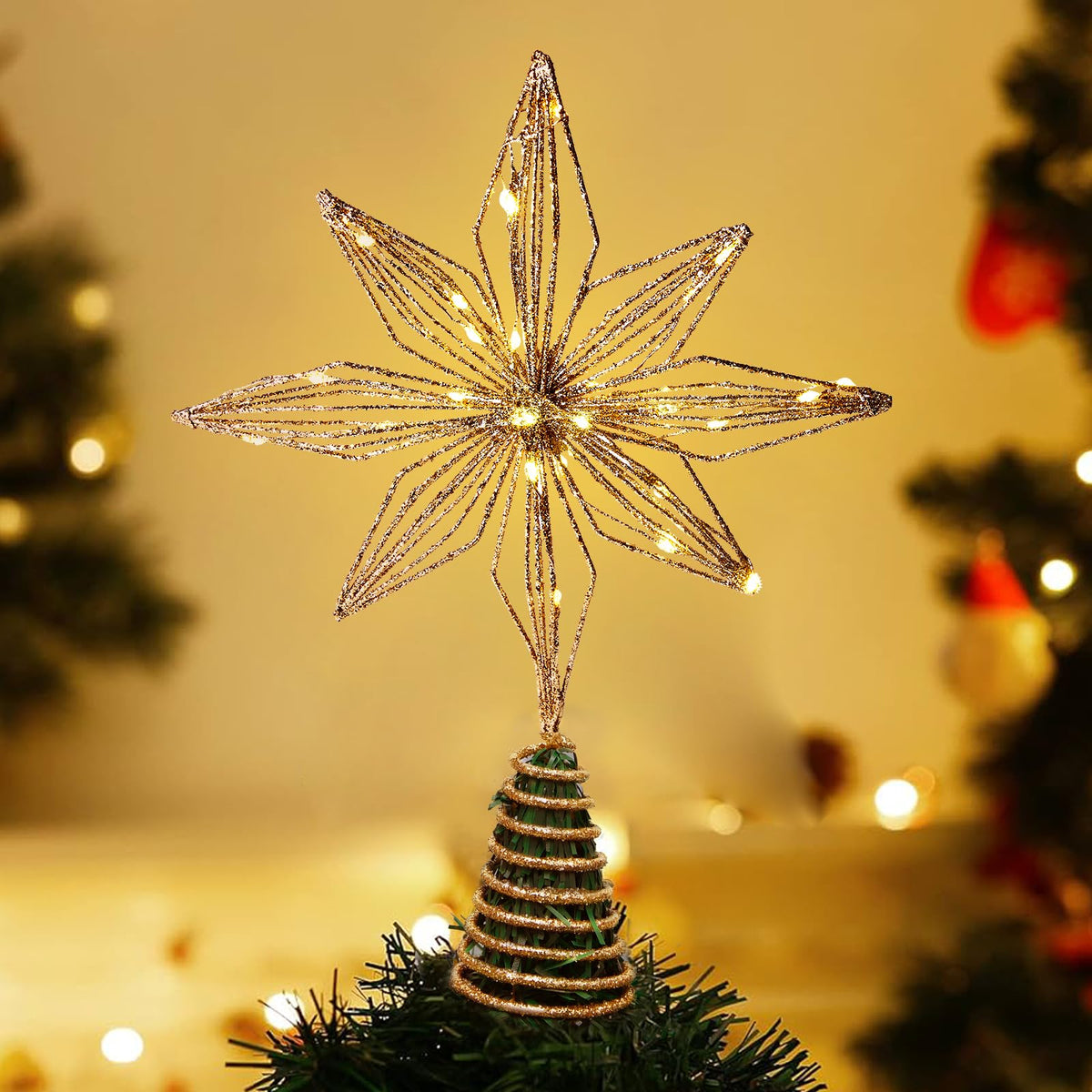 Christmas Tree Topper 10 Golden Glittered Star Tree Topper with 30 LED Lights Xmas Tree Topper Star for Xmas Decorations Ornamen
