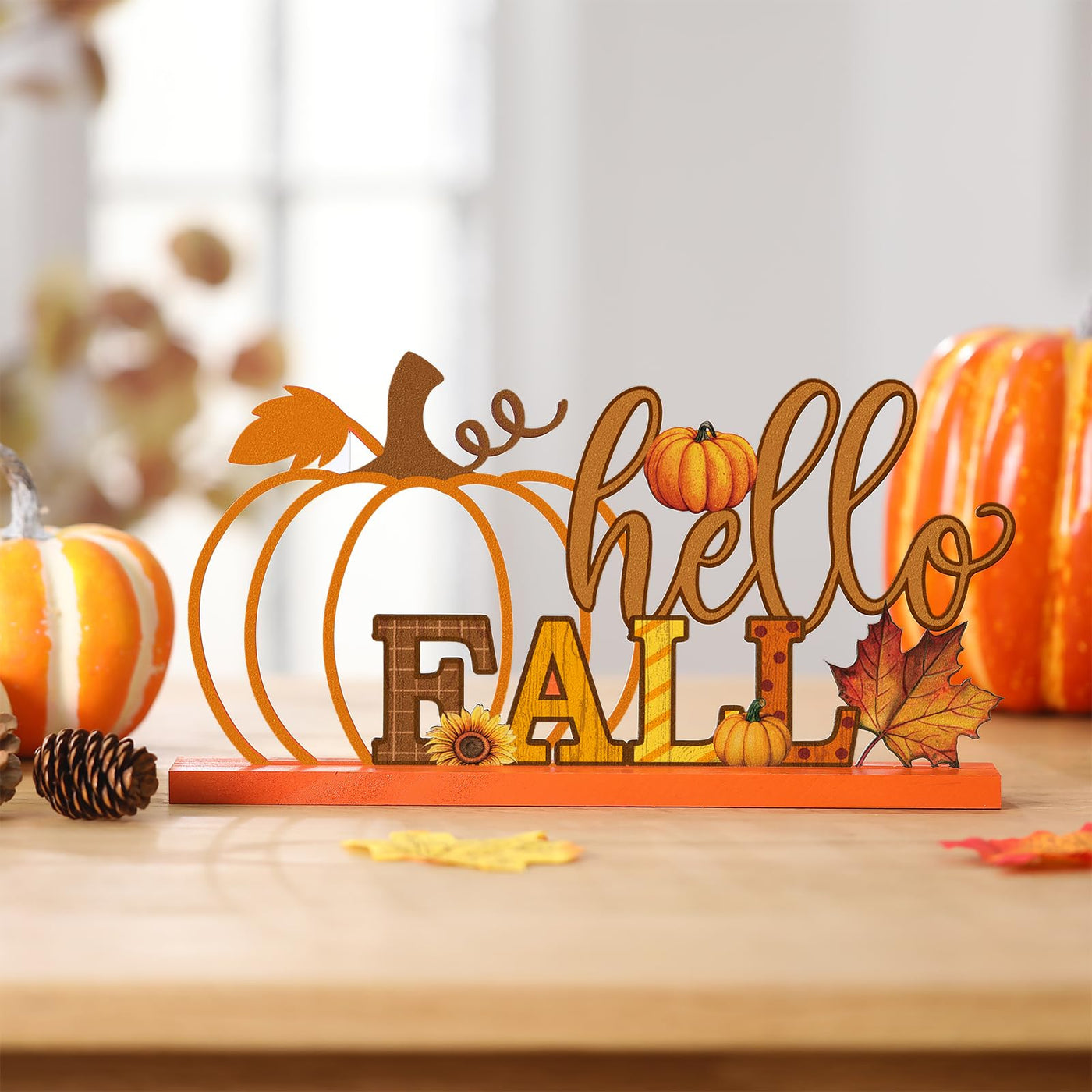 Features: Suitable for any fall themed setting. These versatile pumpkin decorations effortlessly enhance mantels, tables, trays, walls, and more. Ideal for sprucing up your bedroom, living room, porch, or even office space, bringing cozy autumn vibes everywhere! A must have for autumn enthusiasts! This retro pumpkin sign, radiating warm seasonal charm, makes a thoughtful gift for neighbors, family, friends, or coworkers. Surprise your loved ones with a timeless fall treasure they'll adore! Specifications: Material: Letters: metal Base: wood Color: multicolor Size: about 11.8 inches/ 30 cm Package includes: 1 x Fall table sign Notes: Manual measurement, please allow slight errors on size. The color may exist a slight difference due to different screen displays. Small parts included, please keep them away from little kids to avoid swallowing risk.