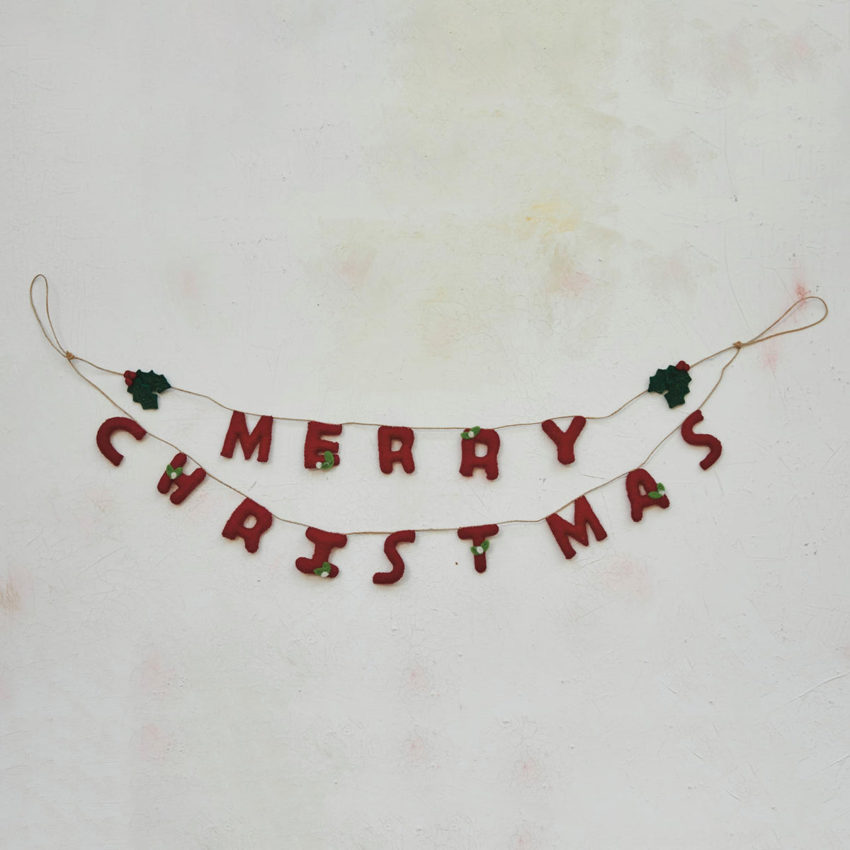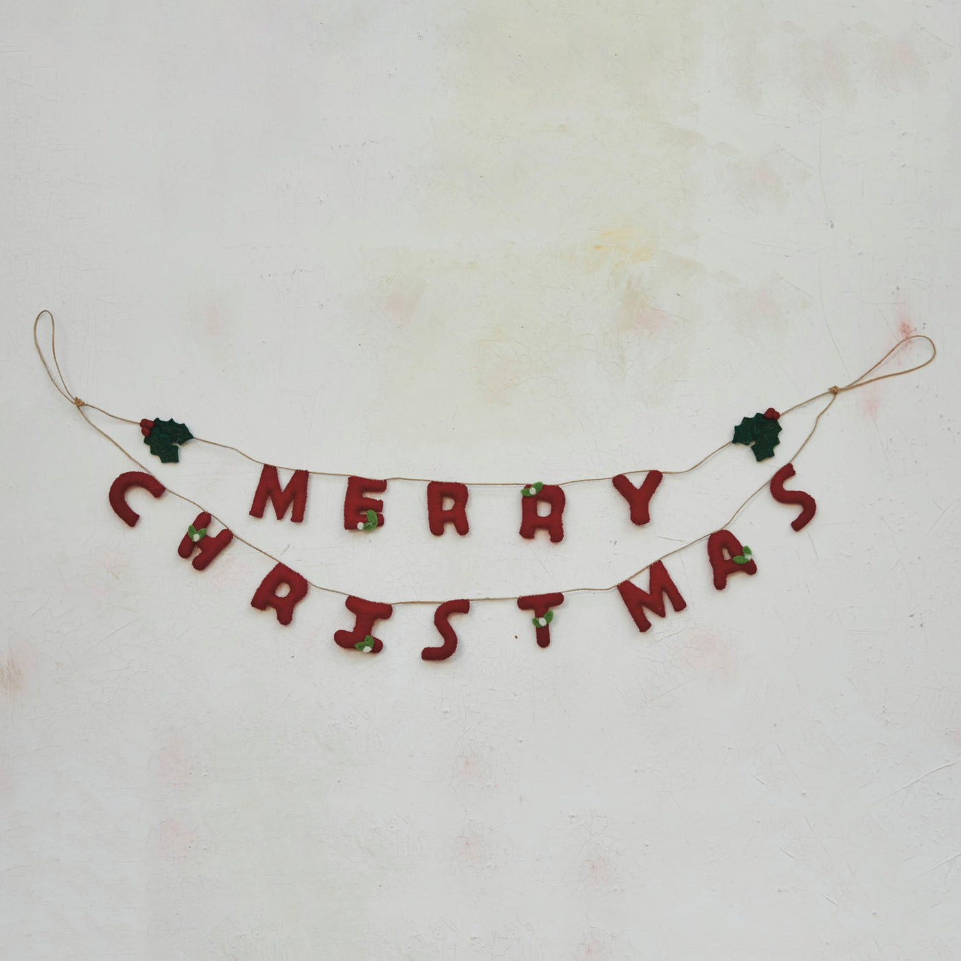 This handcrafted garland is a celebration of the holiday spirit, featuring lush wool felt holly leaves and bright red berries that spell out Merry Christmas. Each element is meticulously created to bring a piece of the holiday cheer into the home. The garland's generous 30-inch length and 8-inch height make it a versatile decoration that can be displayed in a variety of settings. It's a timeless piece that embodies the joy and tradition of the season, inviting a sense of warmth and festivity wherever it's placed. Crafted with care, this garland is not just a decoration but a symbol of the handcrafted beauty that makes the holidays so special.