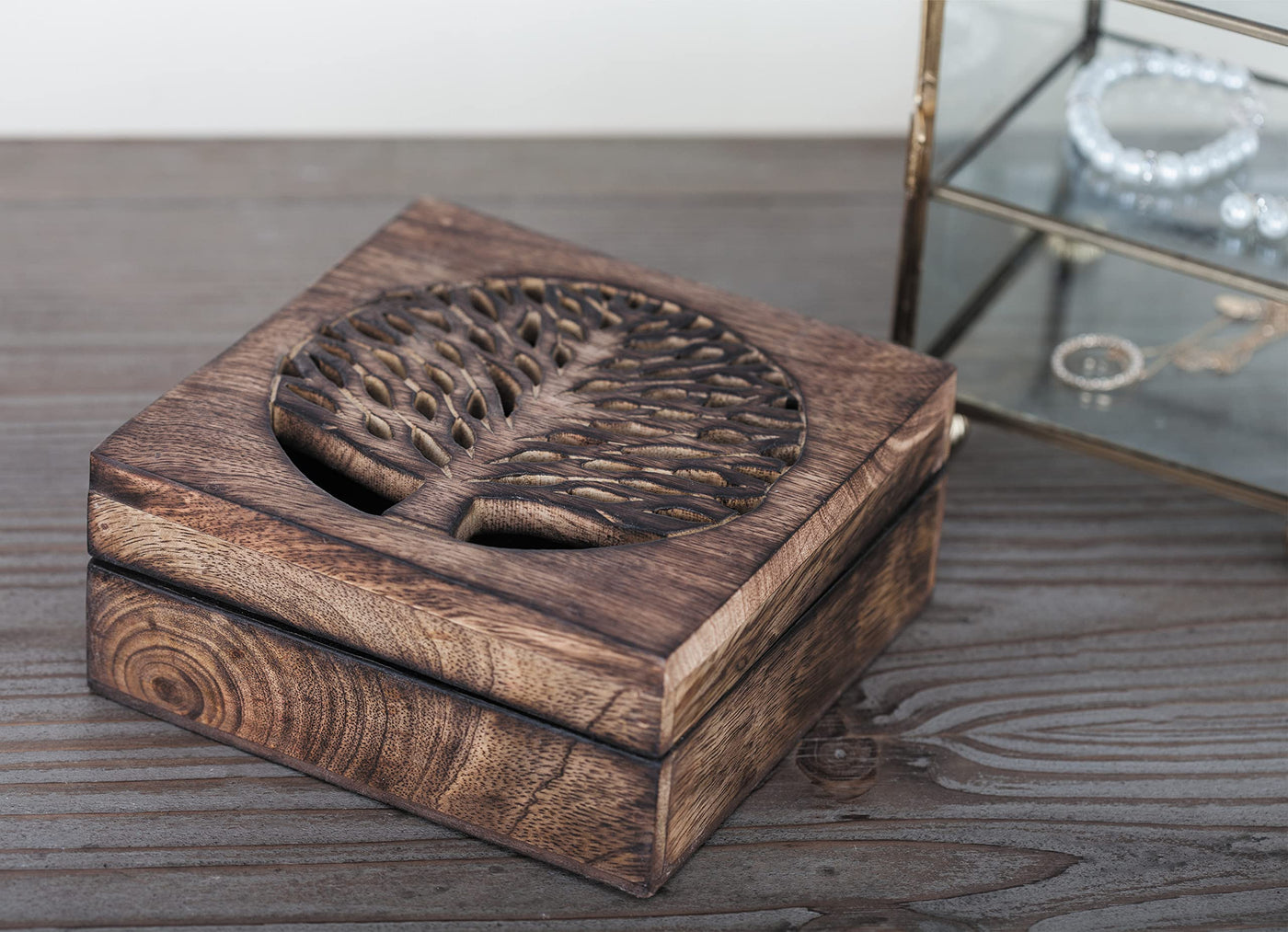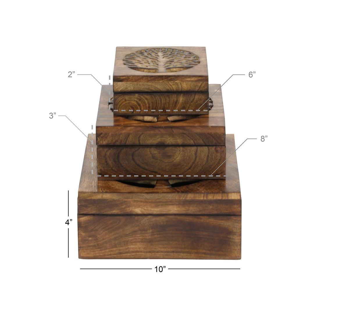 A practical yet stylish upgrade that instantly elevate the look of your room. Perfect way to add depth and texture to your surface space with this compact and discreet box. These wood boxes with lid will make an excellent centerpiece on tables or shelves and a handy storage space for small objects. Designed with felt or rubber stoppers at the base that prevent scratching furniture and table tops, as well as sliding around. This item ships in 1 carton. Wood box makes a great gift for any occasion. Due to the handmade nature of this item, no two will be alike, there will be slight differences in shape, size, and color. Suitable for indoor use only. This item ships fully assembled in one piece. Made in India. This brown colored decorative keepsake box comes as a set of 3. Farmhouse style.
