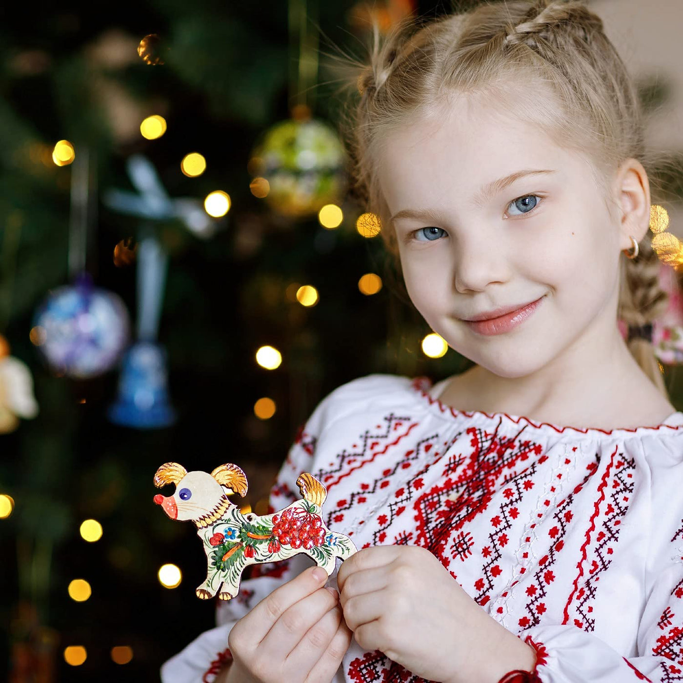 Dog Hanging Ornament For Christmas Tree 3.9 x 3 x 0.2 inches Handcrafted with Floral Patterns of Ukrainian Petrykivka Painting -