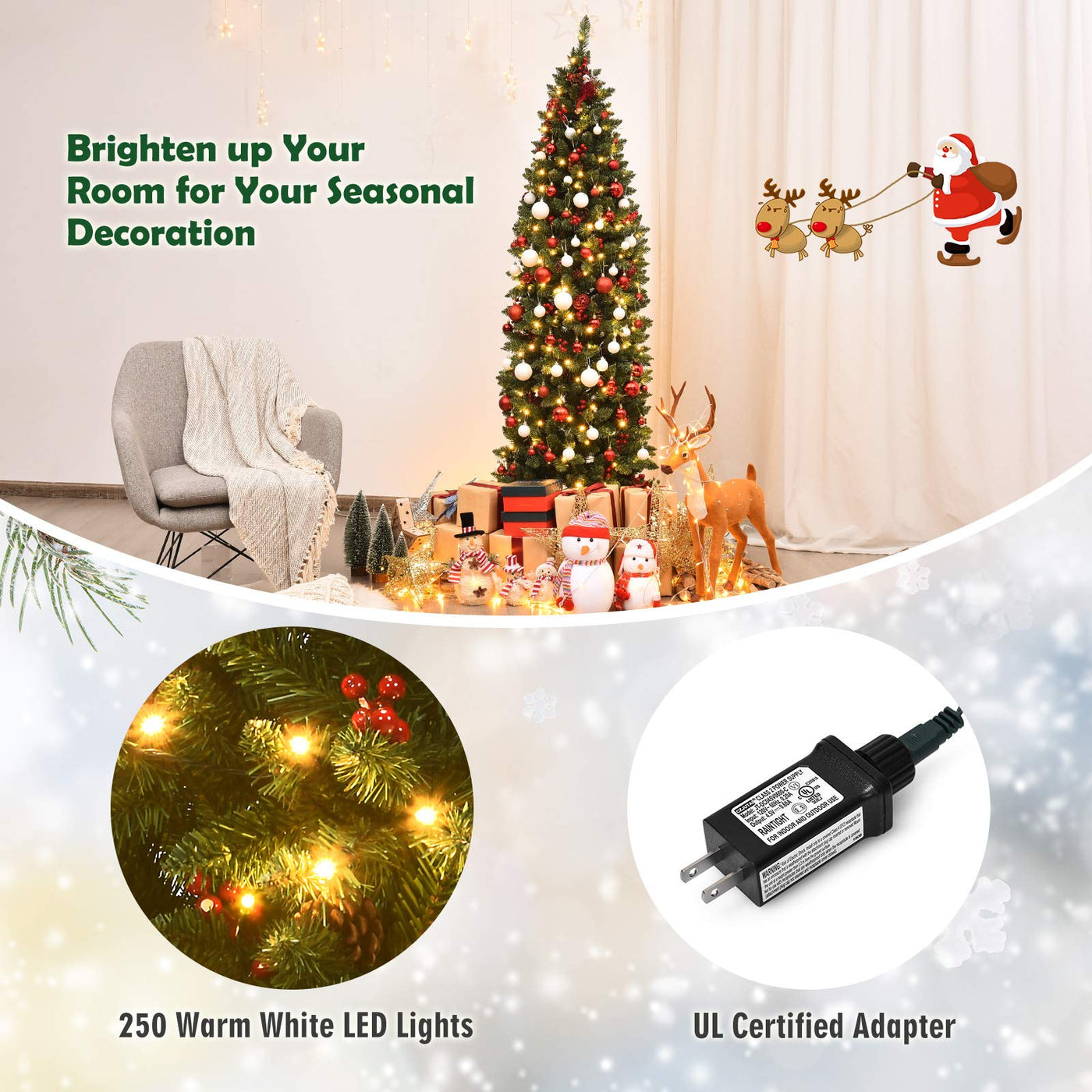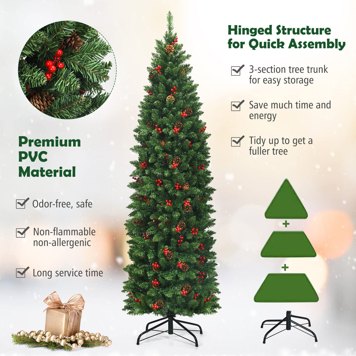 DREAMADE 6.5ft Pre-Lit Artificial Pencil Christmas Tree, Slim Xmas Tree w/ 806 PVC Branch Tips, 250 LED Lights, 62 Pine Cones& R