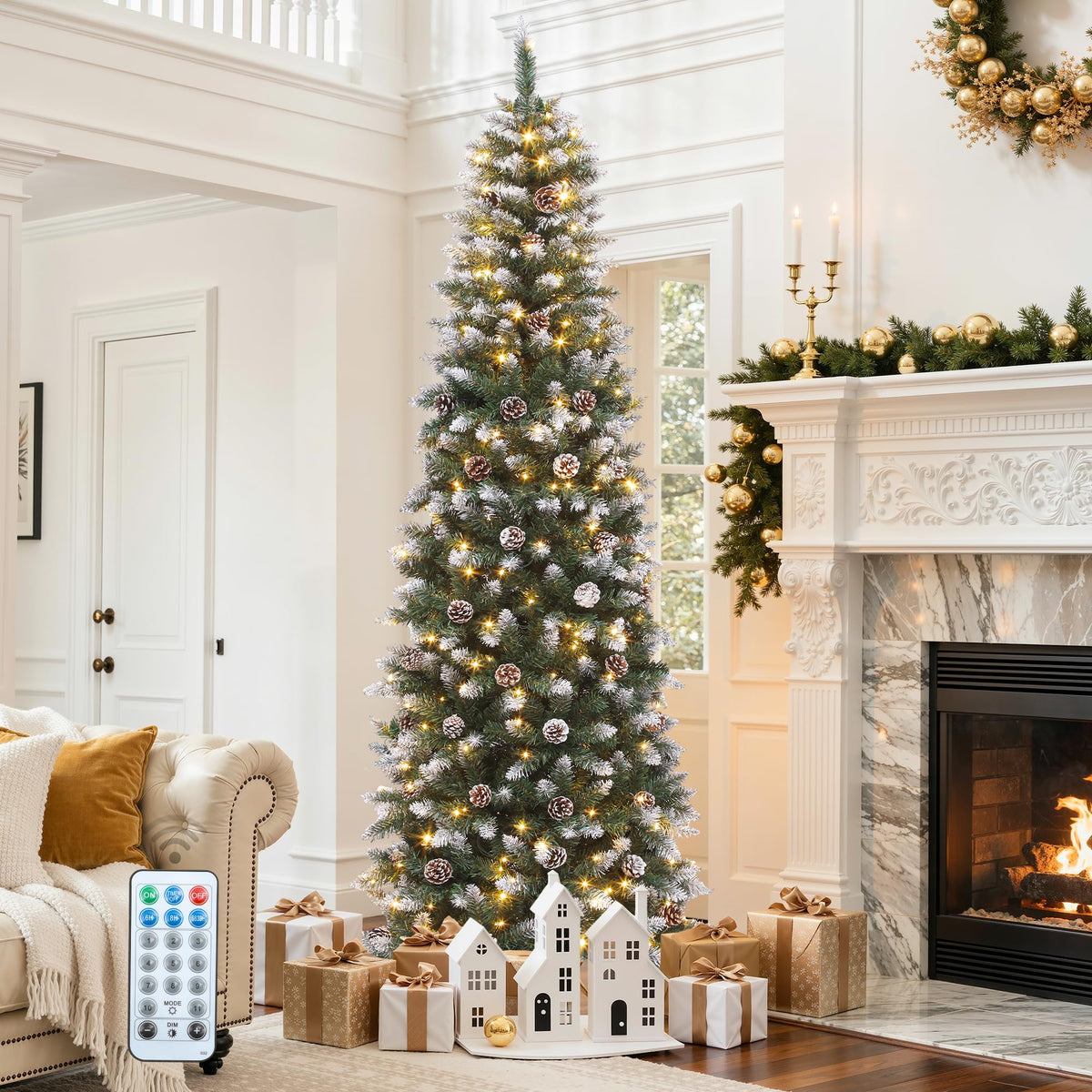 DWVO 6ft Pre-lit Artificial Christmas Tree, Slim Partial Snowy Pencil Kingswood Fir Christmas Trees with 50 Pine Cones, 618 Bran
