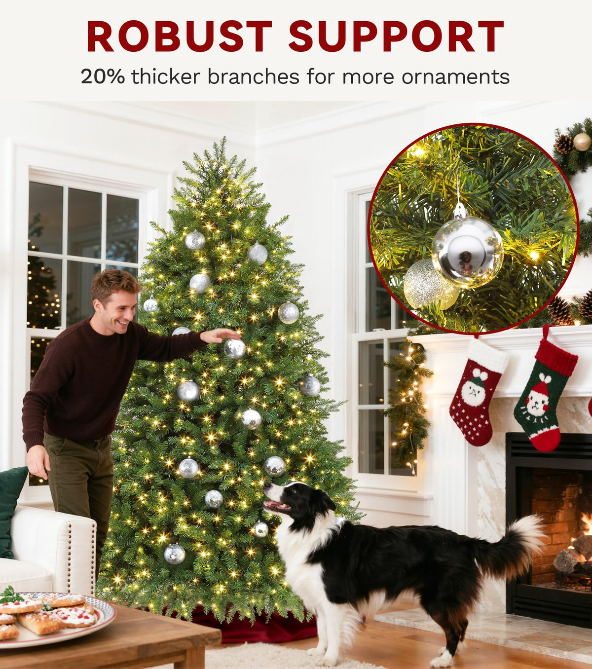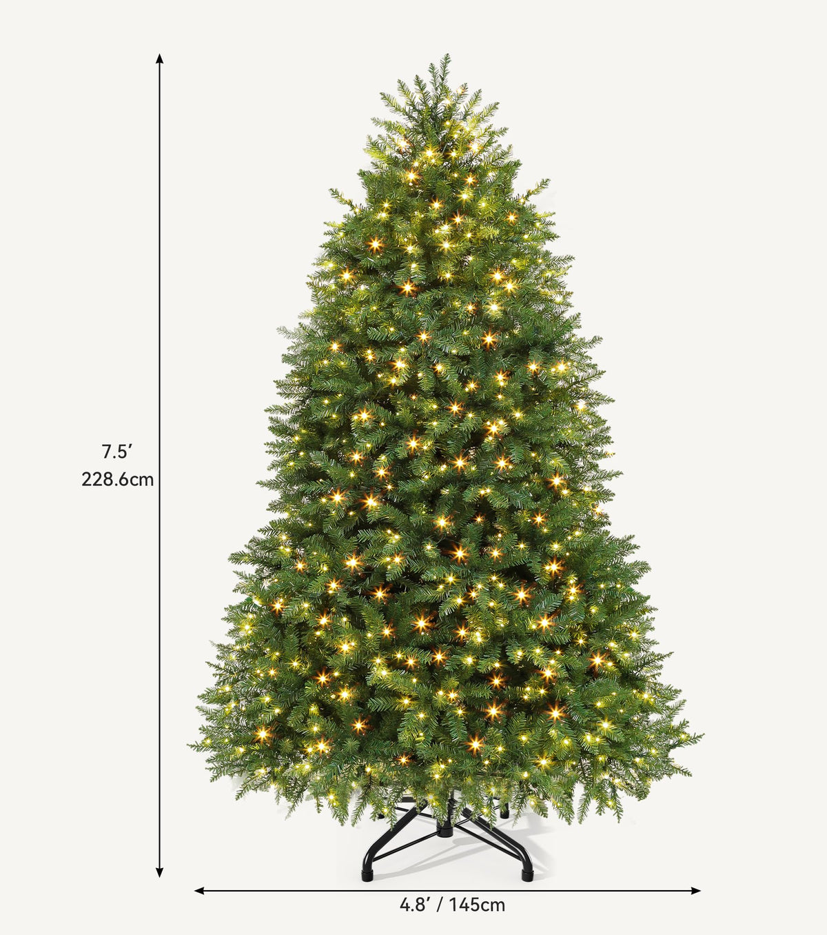 Full Bell-Shape Appearance: After 30 mins fluffing, this realistic christmas tree features flame-resistant PVC with Grand Duchess Balsam Fir-inspired needles. 3D texture offers shed-resistant, lifelike greenery for a full, natural holiday look | Thickened Base & Branches: 20% thicker trunk and branches hold decor firmly. The 7.5 foot christmas tree pre-lit has a reinforced 15.75 metal base with 3 bolts and metal hinges for stability and adjustable shaping | UL Safety Certified: This UL-certified lighted christmas tree ensures safe operation with intact lights and a solid stand. hypo-allergenic, crystal-dusted needles mimic a crystal-covered real feel christmas tree | 3 Colors & 11 Modes: Enjoy warm white and colorful lights with 11 modes, including twinkle, independently controlled by remote control. As a pre-lit LED christmas tree, it allows self-replacement of beads and one broken doesn't affect others, making it a great christmas tree with twinkle lights | Easy Assembly: Hinged frame enables quick setup. Shape branches for seamless fullness. This home christmas tree stands 7.5ft with 2514 tips and 750 lights. Stores easily after the season