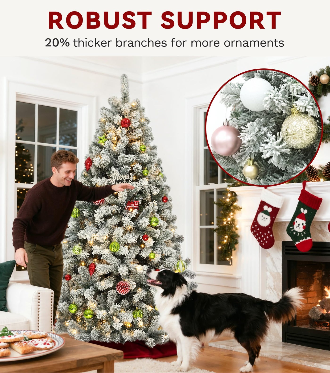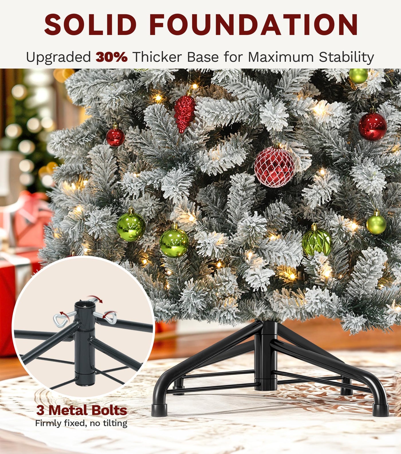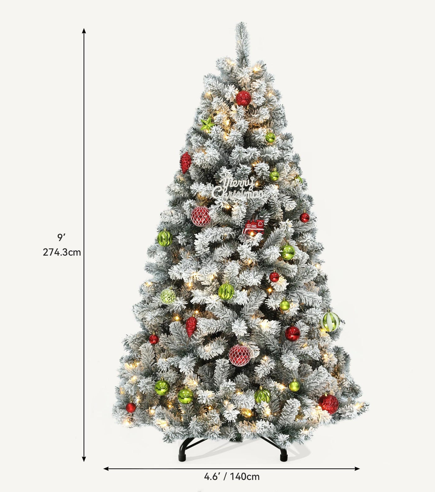 Winter Wonderland: Immerse yourself in holiday magic with our 9 ft snow-flocked artificial Christmas pine tree; Its realistic snowy branches and 2094 adjustable tips offer a stunning backdrop for your decor, adding festive elegance and a personal charm | Effortless Lighting Magic: Brighten your celebrations with 900 pre-installed lights, designed to enhance your holiday spirit while leaving room for extra decorations; With a simple button press, explore 11 dynamic lighting modes to meet your needs | Instant Festive Cheer: Enjoy easy and quick assembly with straightforward hinged section connections to the sturdy base; The pre-attached, hinged branches automatically unfold, requiring only minimal fluffing for a full, seamless appearance | Built to Last: Crafted with an X-shaped iron stand and reinforced base, this tree ensures stability and longevity; The durable branches are ideal for showcasing your favorite ornaments year after year, maintaining their strength and form | Personalize Your Display: Unleash your creativity by decorating with garlands, bells, and stockings; Suitable for homes, weddings, and various venues like restaurants and hotels, this tree adapts to any setting for all your holiday celebrations