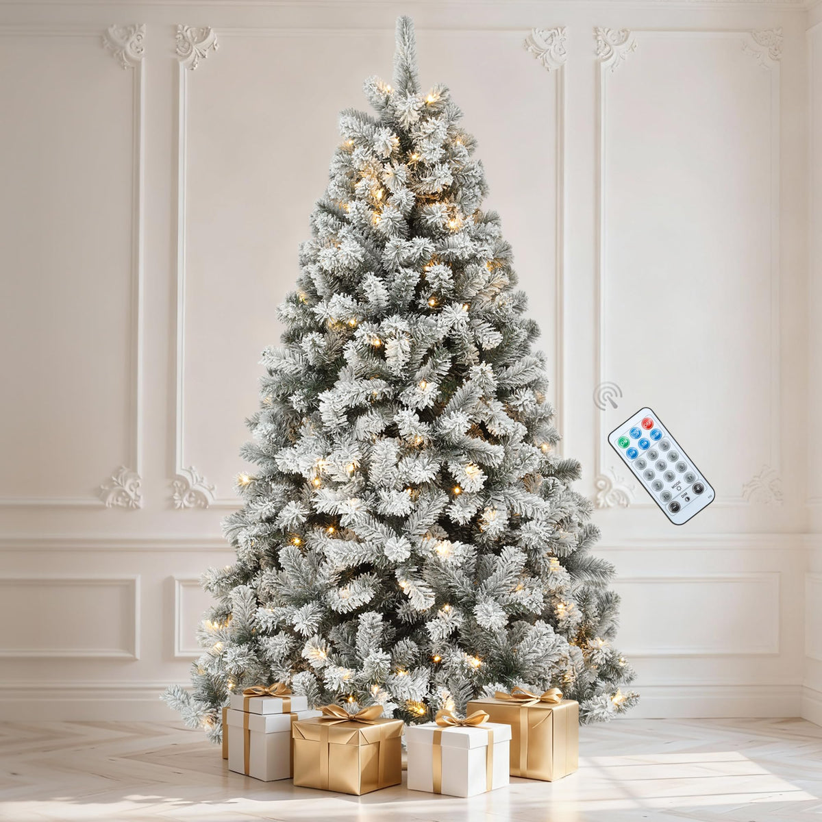 DWVO 9 ft Prelit Snow-Flocked Artificial Pine Christmas Tree, Full Xmas Tree with 900 Lights, 11 Lighting Modes, 2094 Tips, Fold