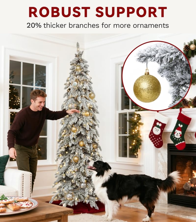 Natural Slender Pencil: The DWVO tree boasts 2288 branch tips, mimicking a natural layered spruce for a distinct appearance; Draped in white flocking, it creates a unique winter atmosphere; Its sleek pencil spruce form is ideal for corners and compact areas, injecting vibrancy and innovation into your surroundings