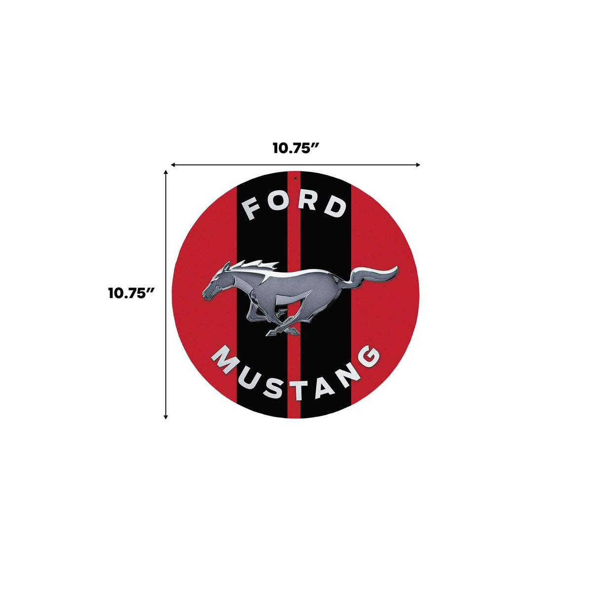 Ford Mustang Round Metal Wall Decor - Iconic Running Horse Logo with Red and Black Racing Stripes