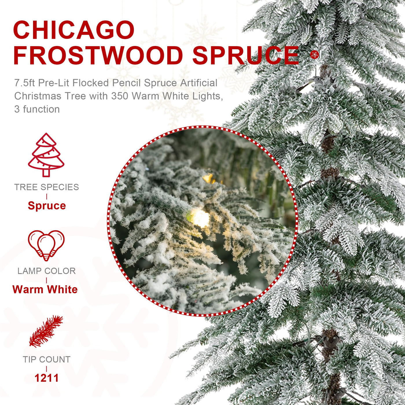 Specifications: Tree: PE,PVC,Metal Stand: Metal Artificial Tree Type: Fir Size: 31.5L x 31.5W x 90H Branch Tip Count : Total 1211 tips, 639 PE tips and 572 PVC tips Light count: Pre-lit 350 warm white LED light bulbs *Natural layered spruce look realistic, fits beautifully in both large and small spaces *Elegant slim spruce without taking much space *Hinged construction, shape tree by fluffing out the branches and tips *Sprinkled with snow and iridescent glitter, each piece may feature slight glitter falling off Features: 1. This 7.5ft Pre-Lit Flocked Pencil Spruce Artificial Christmas Tree create a unique wintery feel, it will be an eye-catching addition to any room during the Christmas holidays. 2. Glitzhome Christmas trees use sturdy metal stand, built to endure many holidays, provide strong support for the tree and ensure stability, serve you for a long time. 3. The Christmas tree with warm white lights adds a winter feel to any decor, thousands of branch tips provide generous amount of space to hang up Christmas ornaments and decor, classic Christmas elements and snow make it a great decor for Christmas and festivals, adds more excitement to your life, makes your family full of Christmas atmosphere. Package includes: 1 x 7.5ft Pre-Lit Flocked Pencil Spruce Artificial Christmas Tree with 350 Warm White Lights