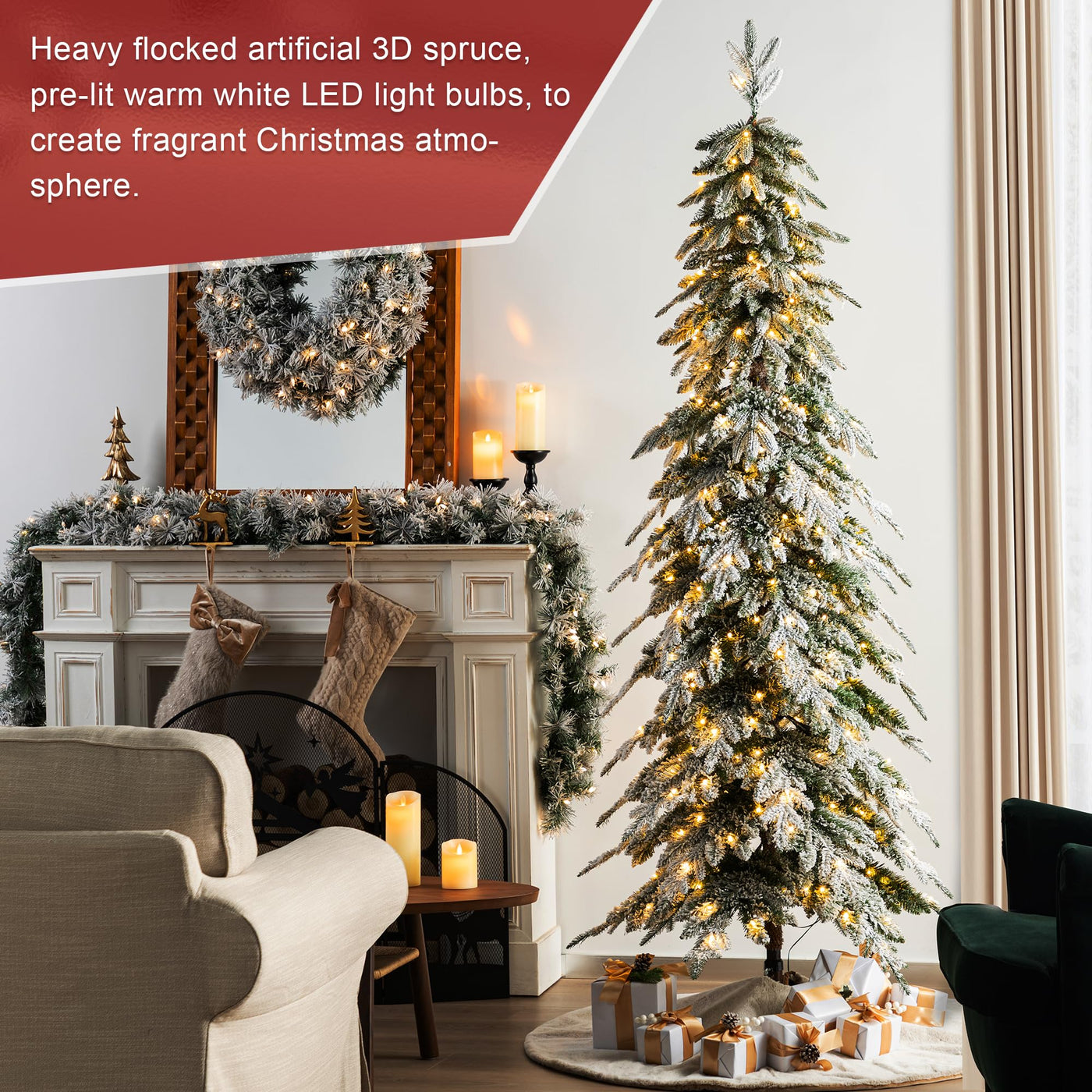 Glitzhome 7.5ft Artificial Christmas Tree, Pre-Lit Flocked Pencil Christmas Tree Chicago Frostwood Spruce with 350 Warm White Li