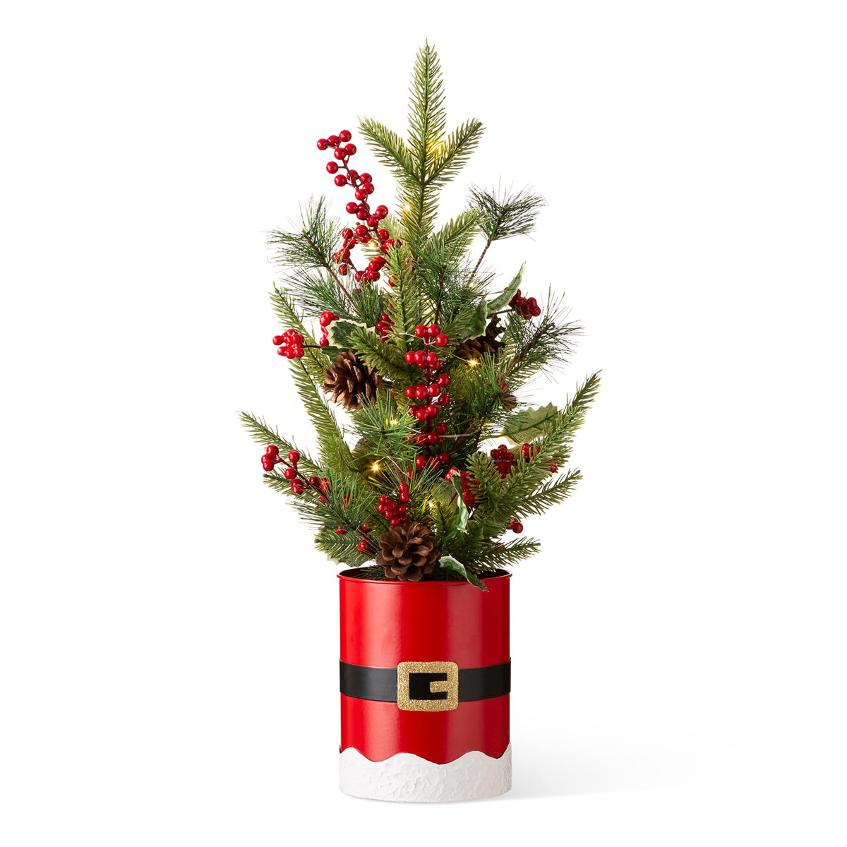 Glitzhome Lighted Christmas Tree for Tabletop Decorations 21 H Mini Artificial Christmas Santa Belt Potted Table Trees with Meta