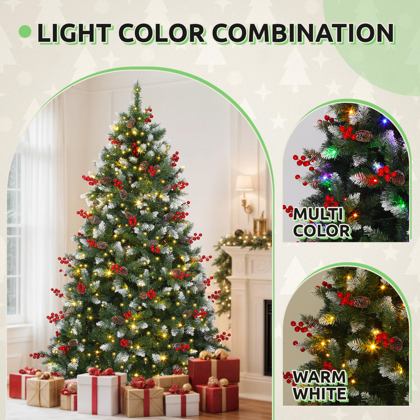 GOOBED Prelit Pre-Decorated Green Christmas Tree, standing at 7.5ft with 1398 PVC Tips,pre-decorated 82 Pine Cones, 82 Red Berries, features a full, enduring silhouette and lush foliage for a captivating holiday atmosphere. Its pre-connected hinged branches offer easy assembly and adjustment for a perfect look. With 550 pre-installed lights in 2 colors and 11 modes, this tree quickly transforms into a dazzling spectacle. Easily manage your trees lights, modes, and brightness with the included remote control. Simply aim it at the lights switch for seamless operation from up to 13 feet away, giving you full control without needing to get close. Its durable quality is ensured with a thickened X-shaped iron base and robust branches that can accommodate all your decorations. Versatile for various styles and settings, it adds a festive touch to any space.
