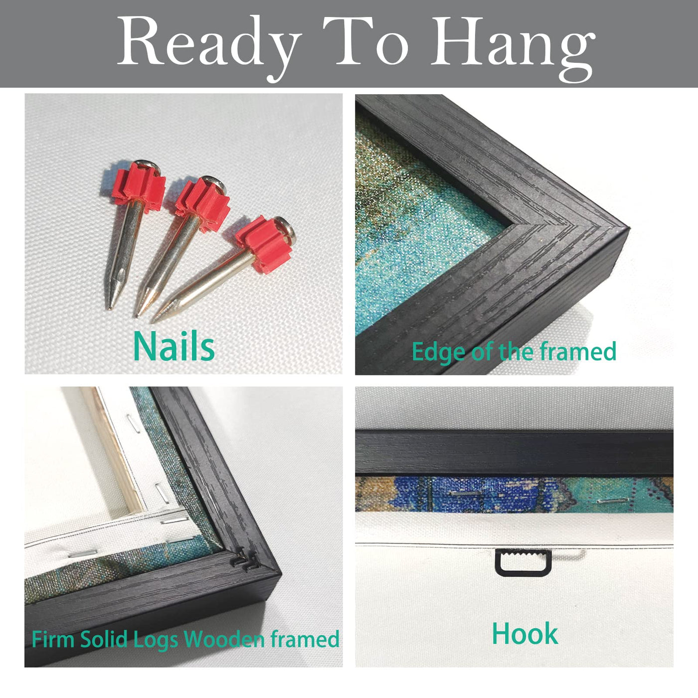 - Q: Is the canvas painting ready to hang? A: Yes, the canvas painting comes stretched on solid wooden frames, gallery wrapped, and includes hooks and accessories for easy hanging.