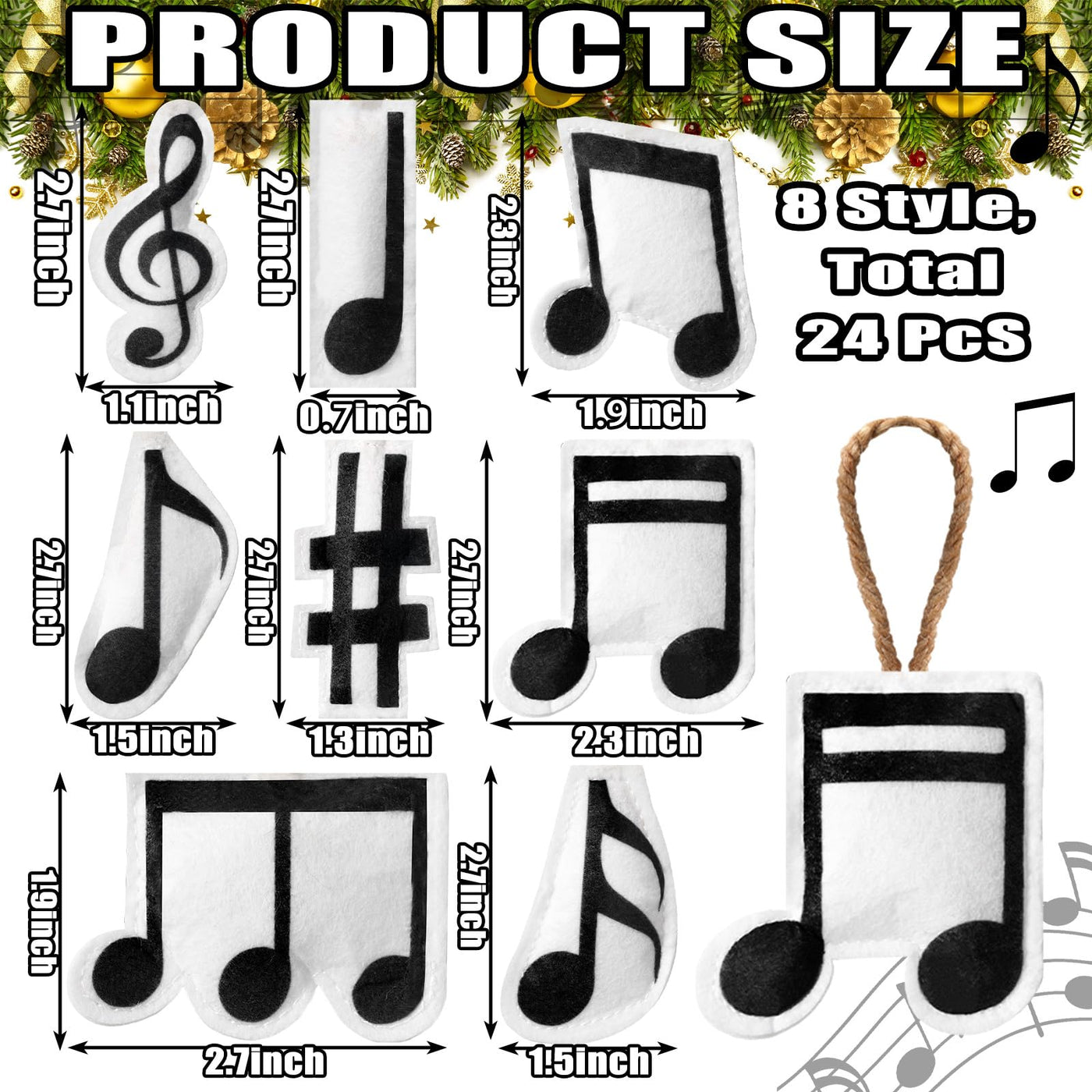 Features: Sponge Filling: Each musical note ornament is filled with sponge, allowing you to enjoy its decorative charm year after year. These musical Christmas ornaments maintain their vivid look and feel, providing a more lasting decorative effect, showing your love for music in every detail. Festive Atmosphere: Our musical ornaments are designed to easily fit into a variety of holiday themes. As musical Christmas ornaments, they can be hung on seasonal Christmas trees or applied as a finishing touch in the arrangement, adding a touch of musical joy and artistic atmosphere to set off your holiday atmosphere. Specifications: Material: felt Color: black Package includes: 24 x Music note ornament Notes: Manual measurement, please allow slight errors on size. The color may exist a slight difference due to different screen displays