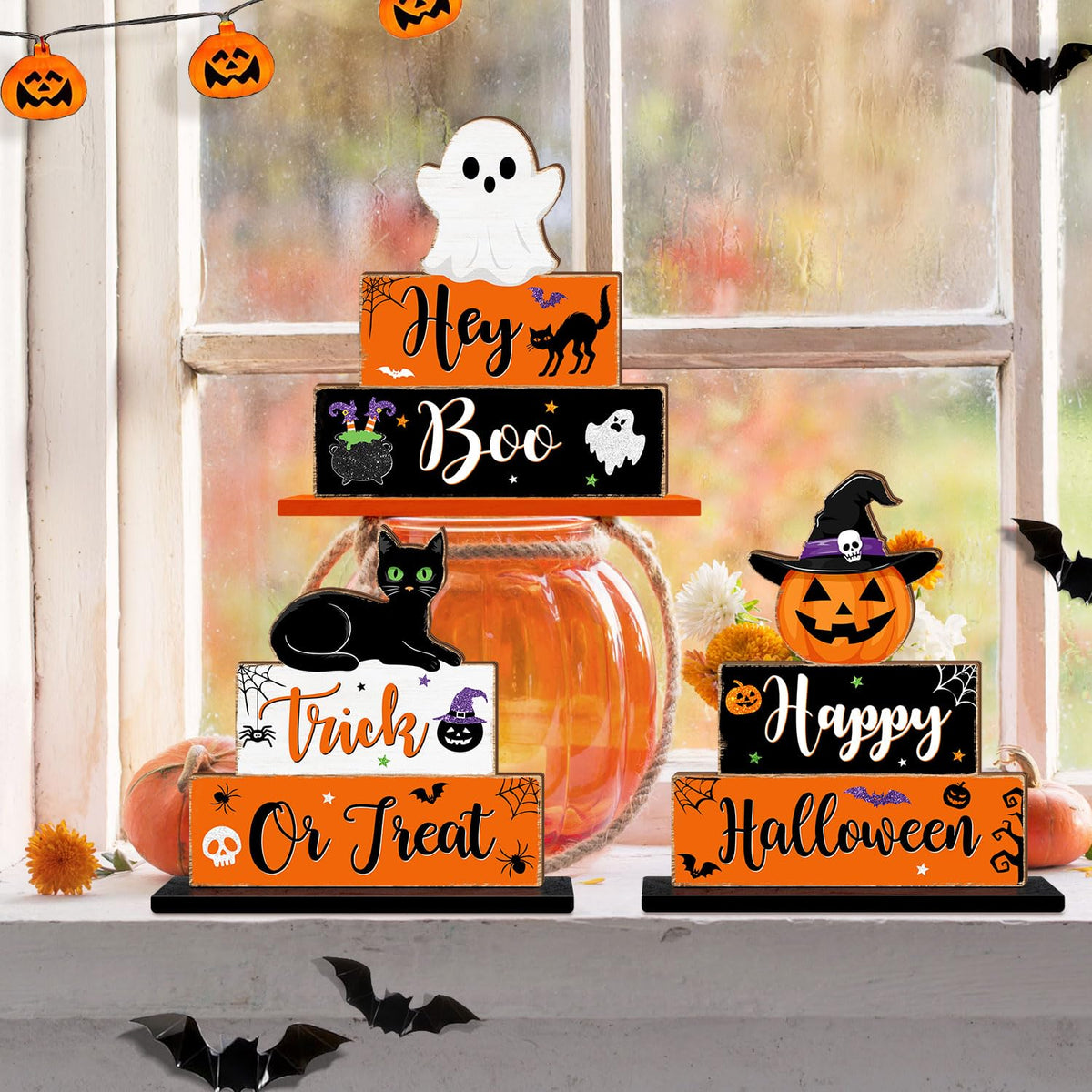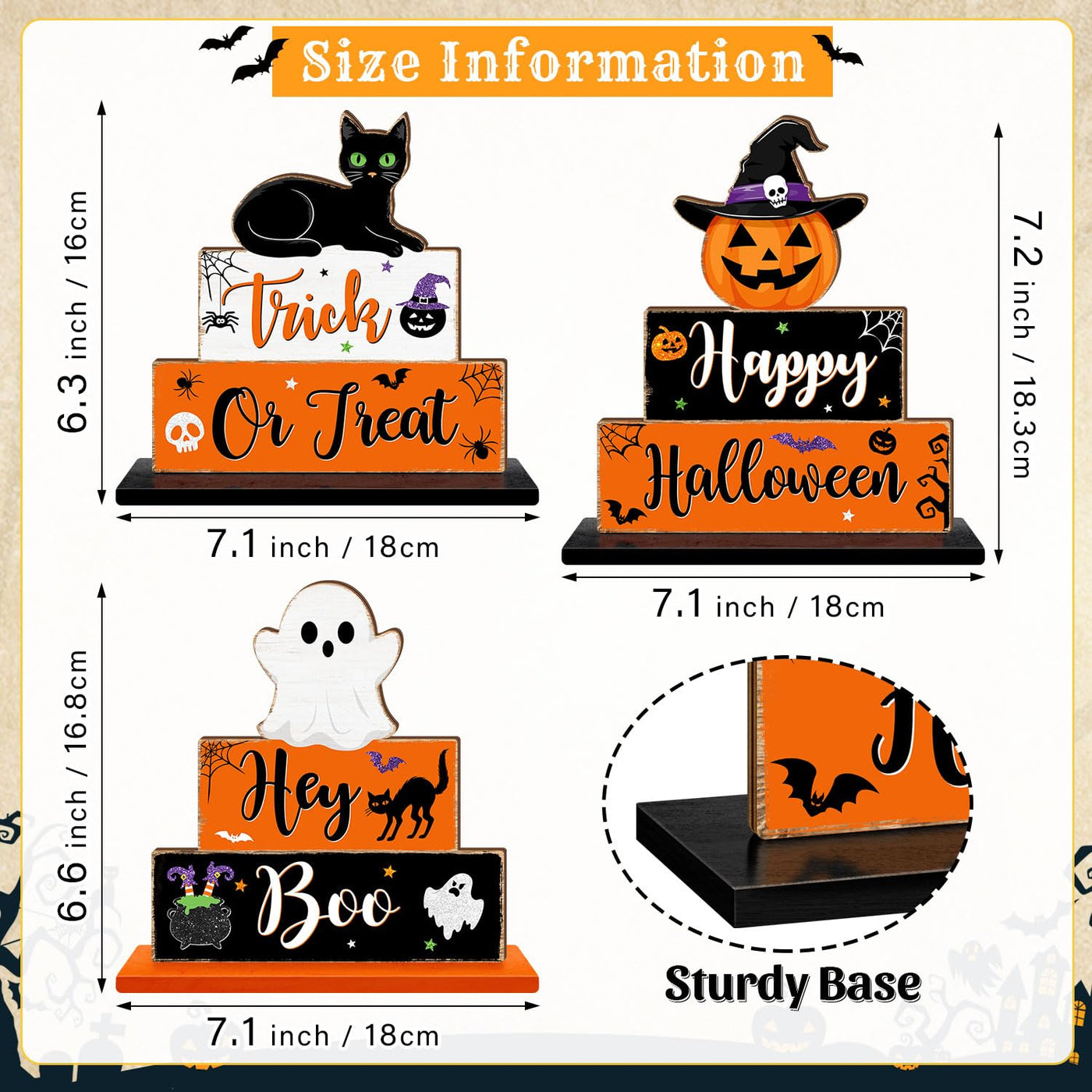 Designed for Halloween Add a spooky and charming touch to your Halloween decor with this set of 3 delightful wooden table signs. Each piece features classic Halloween motifs including a black cat with striking green eyes, a friendly ghost, and a jack-o'-lantern wearing a witch hat. The signs display festive phrases like 'Trick or Treat,' 'Hey Boo,' and 'Happy Halloween' in elegant script, complemented by playful decorative elements such as spider webs, bats, stars, and skulls. Just the Right Size The size of each wood sign measures approx 7.1x7.2inches, which is perfectly sized for tabletop display, with layered design elements that create depth and visual interest. Each sign comes with a sturdy base for stable tabletop display, making them perfect for mantels, shelves, or as centerpieces. Nice Workmanship Halloween table centerpiece is crafted with quality wood, safe and odorless, heavy duty and keep in good shape, will not fade and deform, with high precision HD UV Printing tech to achieve bright graphics and water proof effect, reliable workmanship. You can easily assemble the wooden base and sign together. Novel Gift These vintage-style decorations feature distressed details for a rustic charm that adds character to your Halloween festivities.You can not only use this Halloween table sign to decorate your home, but also can send it as a practical gift to your friends and family. An exquisite and novel gift will surprise them so much! Wide Application This lovely Halloween tiered tray decoration is free standing design, sit these wood signs onto your book stack or stand it on tabletop on Halloween. Can be used to decorate many places in your home, such as tabletop, bookshelf, fireplaces, windowsill, tiered tray, office desk, coffee bar, mantel and cabinets.