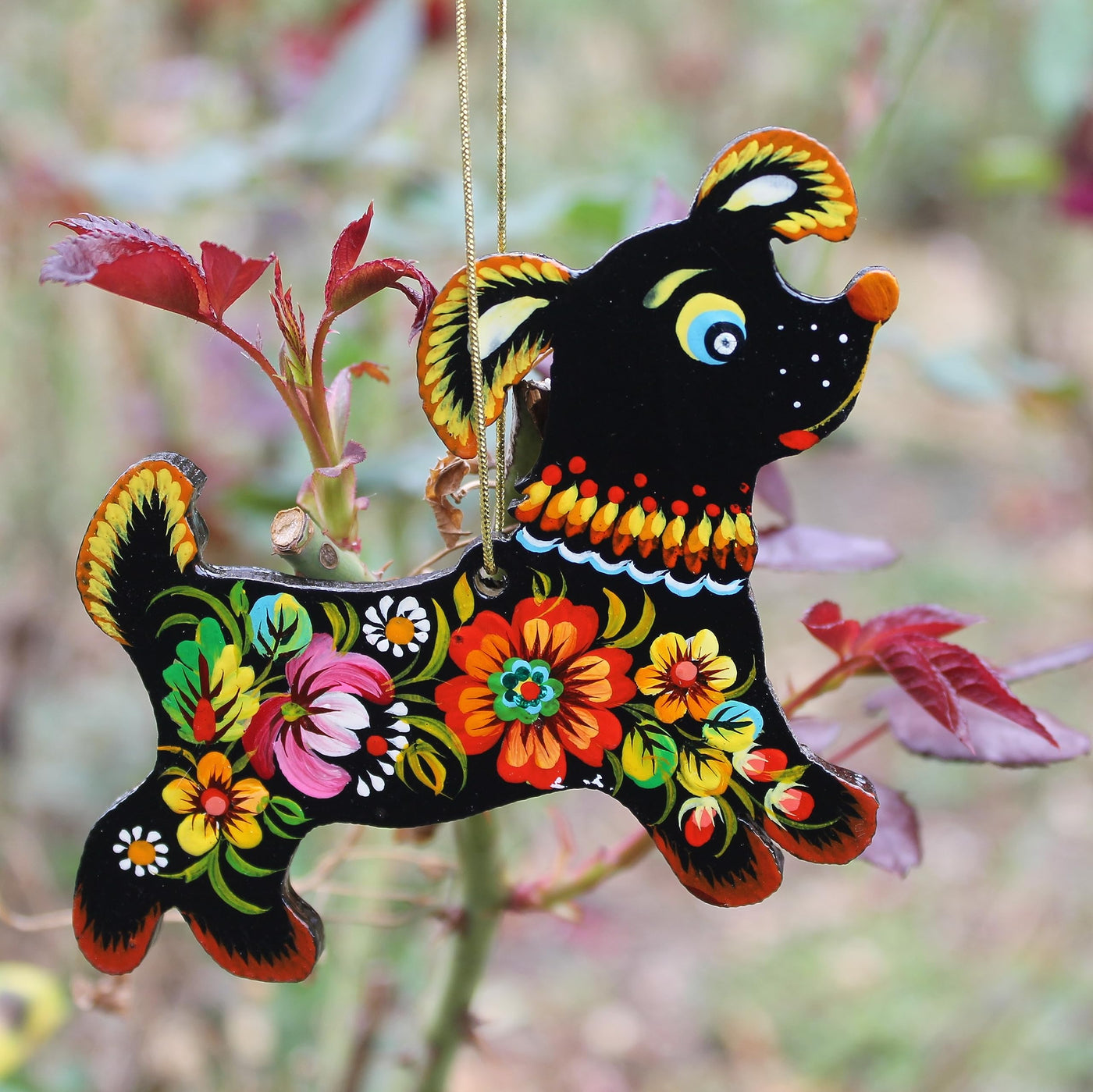 Hanging Dog Ornament Wooden Flat Pet Decoration 3.9 x 3 x 0.2 inches Hand-painted with Floral Patterns of Ukrainian Petrykivka P