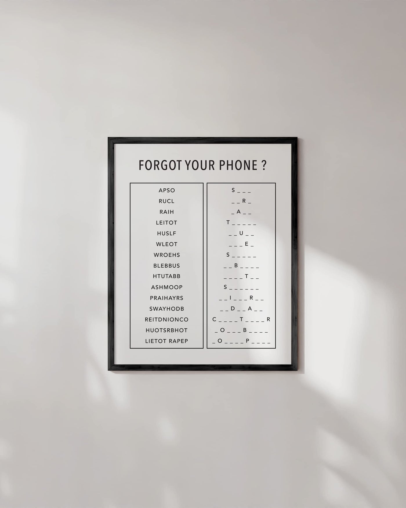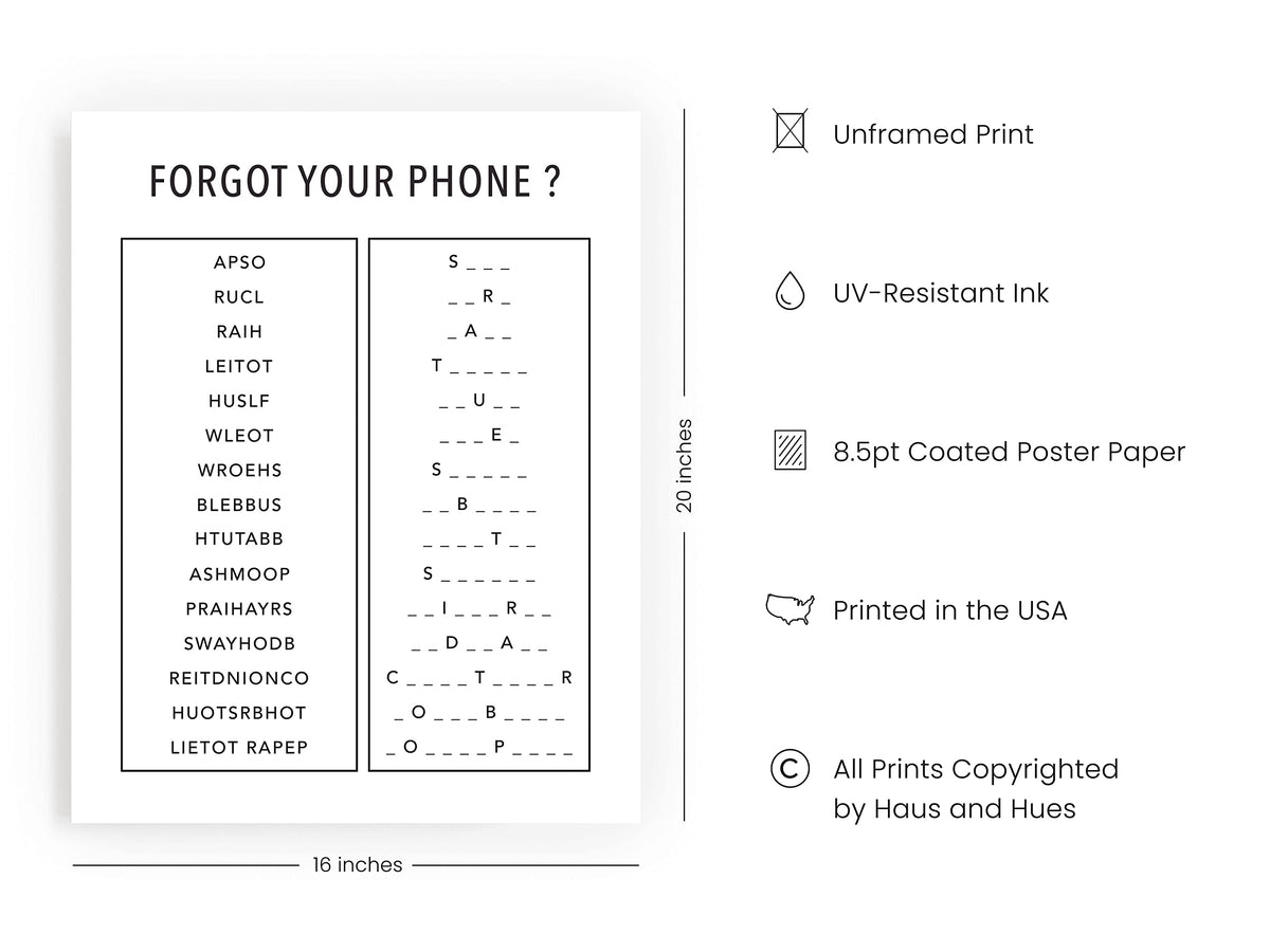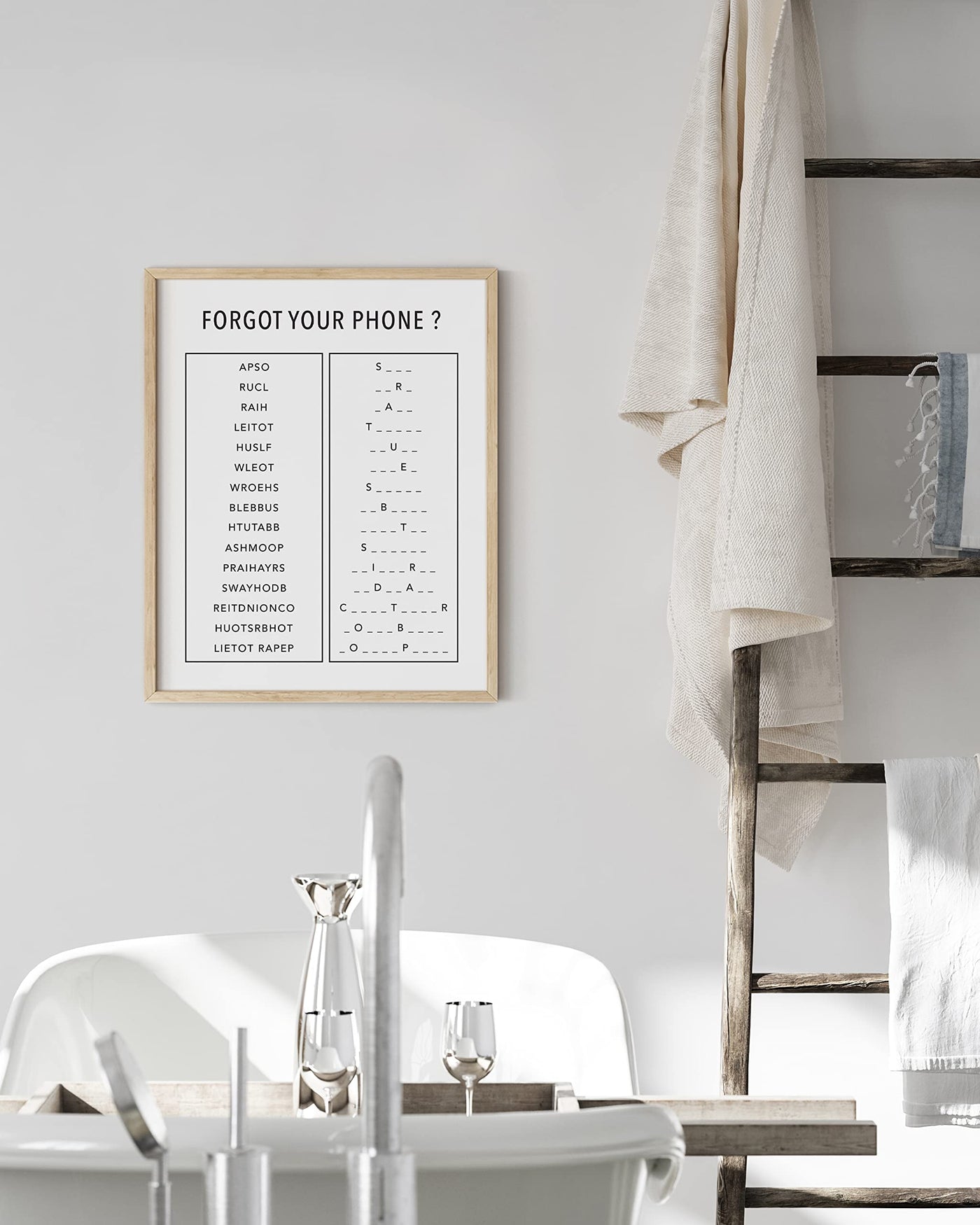 - Q: Is the print suitable for guests to interact with? A: Yes, the print features a word game designed to entertain guests while they are in the bathroom.