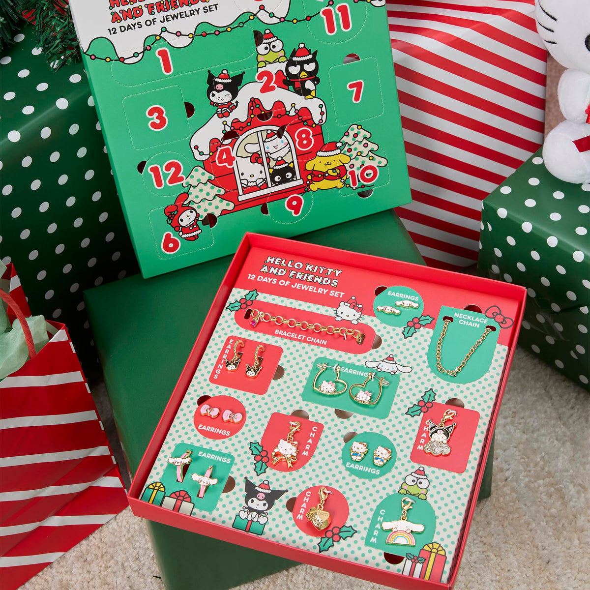 Celebrate the 12 days of Christmas with the Officially Licensed Sanrio Hello Kitty and Friends Advent Calendar, a festive and charming holiday countdown filled with adorable surprises. Each of the 12 doors reveals a different piece of jewelry, including clip-on charms, a bracelet, necklace, and earrings. Inside, youll find 3 stud earrings, 2 hoop earrings, dangle Kuromi earrings, charm bracelet, necklace chain, and 4 lobster clip charms-perfect for mixing and matching on the necklace and bracelet. A rhinestone heart charm, Hello Kitty bow charm, Kuromi cloud charm, and Cinnamoroll rainbow charm are showcased. Alongside Hello Kitty, beloved Sanrio characters Kuromi and Cinnamoroll also make an appearance, with their own earrings and charms. The kawaii jewelry is crafted in yellow gold-tone with colorful enamel details and crystal accents. The necklace measures 18 inches, and the charm bracelet is 7 inches with a 1-inch extender, both featuring secure lobster clasp closures. The earrings include post backs for the studs and dangling, and lever backs for the hoops. This authentic Sanrio jewelry advent calendar makes a delightful Secret Santa and Christmas gift, sure to charm any Hello Kitty fan with its kawaii style and festive sparkle.