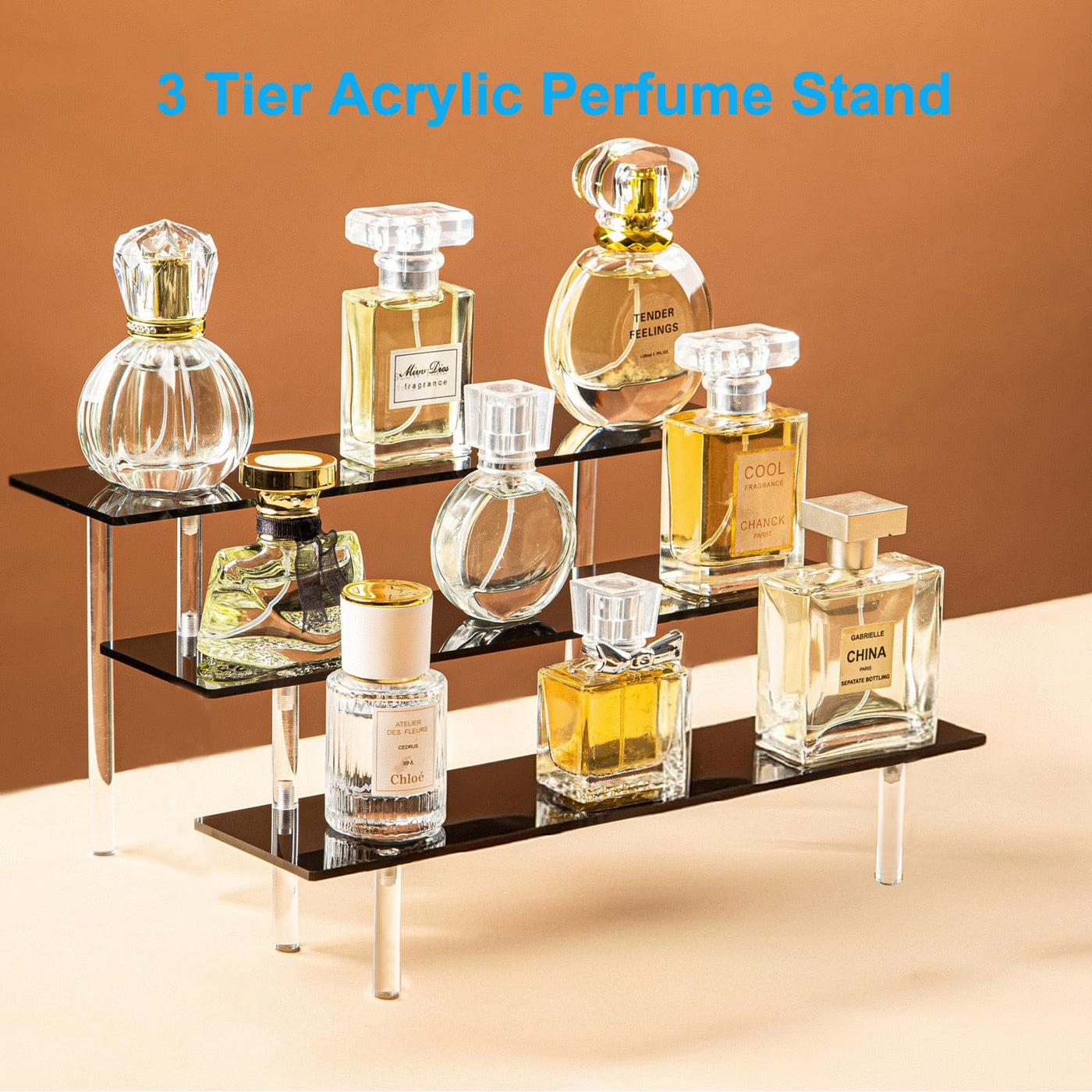 HENABLE 3 Tier Perfume Organizer Stand, Black Acrylic Risers Display Stands, Cologne Shelf Dessert Display for Party, Figure Sta