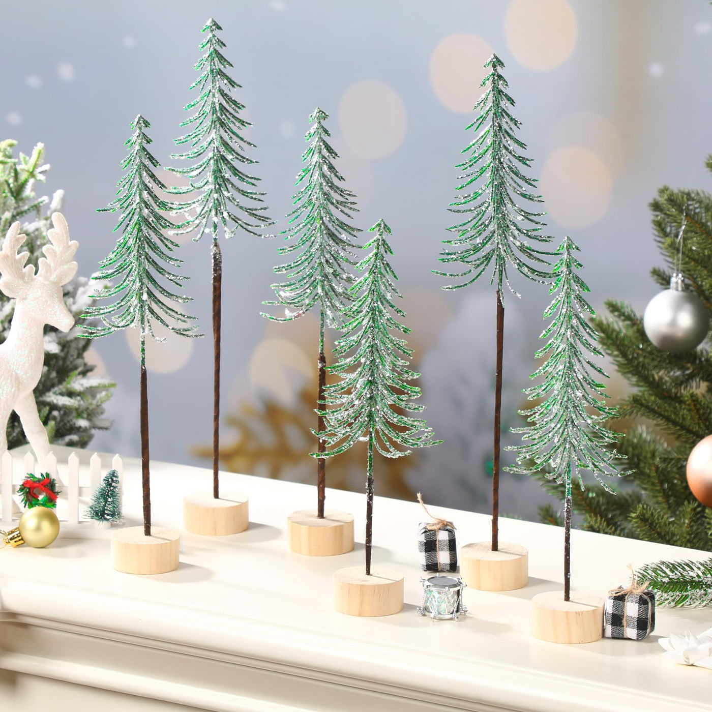 Features: These artificial mini Christmas trees are special home party decorations that will liven up any gathering. Their realistic appearance and snowflake effect make them a mesmerizing centerpiece, adding a festive touch to your celebrations. Each miniature tree features a reliable wooden base that ensures stability, making them incredibly easy to stand wherever you desire. This user-friendly feature means you can quickly set up a charming holiday scene without the hassle Specifications: Material: plastic and wooden Color: green Size: 10, 12, and 14 inches Package includes: 6 x Mini Christmas trees Notes: Manual measurement, please allow slight errors on size. The color may exist a slight difference due to different screen displays.